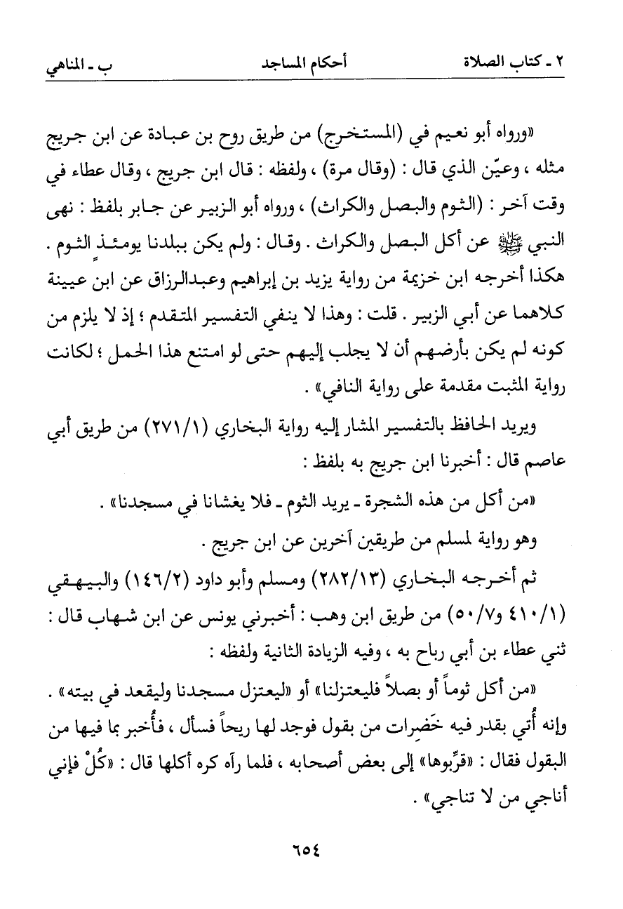 (ورواه أبو نعيم في (المستخرج) من طريق روح بن عبادة عن ابن جريج مثله وعين الذي قال: (وقال مرة) ولفظه: قال ابن جريج وقال عطاء في وقت آخر: (الثوم والبصل والكراث) ورواه أبو الزبير عن جابر بلفظ: نهى النبي صلى الله عليه وسلم عن أكل البصل والكراث. وقال: ولم يكن ببلدنا يومئذ الثوم. هكذا أخرجه ابن خزيمة من رواية يزيد بن إبراهيم وعبد الرزاق عن ابن عيينة كلاهما عن أبي الزبير. قلت: وهذا لا ينفي التفسير المتقدم إذ لا يلزم من كونه لم يكن بأرضهم أن لا يجلب إليهم حتى لو امتنع هذا الحمل لكانت رواية المثبت مقدمة على رواية النافي)