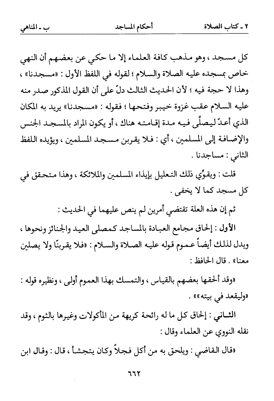 الأول: إلحاق مجامع العبادة بالمساجد كمصلى العيد والجنائز ونحوها ويدل لذلك أيضا عموم قوله عليه الصلاة والسلام: (فلا يقربنا ولا يصلين معنا). قال الحافظ: