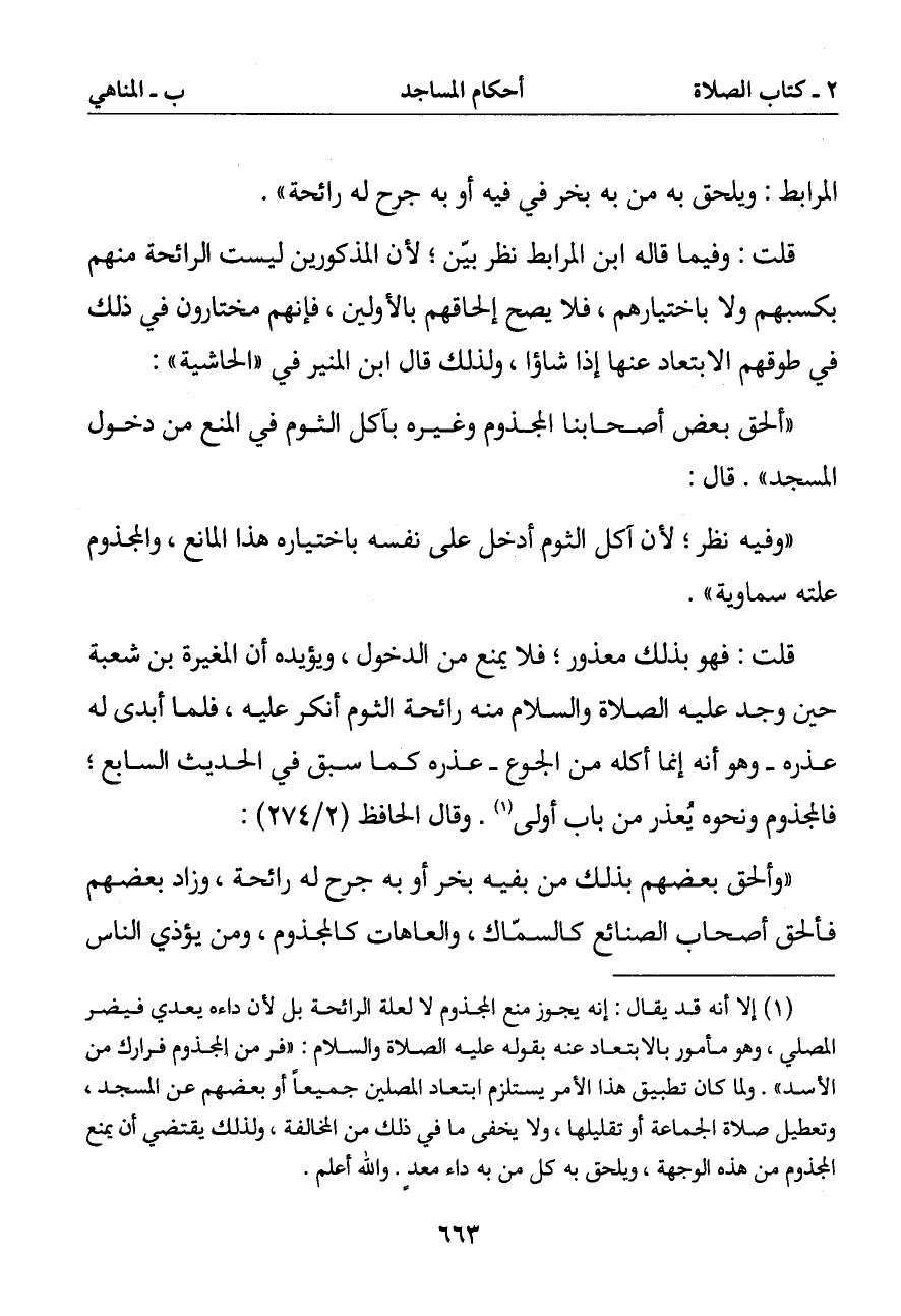 (1) إلا أنه قد يقال: إنه يجوز منع المجذوم لا لعلة الرائحة بل لأن داءه يعدي فيضر المصلي وهو مأمور بالابتعاد عنه بقوله عليه الصلاة والسلام: (فر من المجذوم فرارك من الأسد). ولما كان تطبيق هذا الأمر يستلزم ابتعاد المصلين جميعا أو بعضهم عن المسجد وتعطيل صلاة الجماعة أو تقليلها ولا يخفى ما في ذلك من المخالفة ولذلك يقتضي أن يمنع المجذوم من هذه الوجهة ويلحق به كل من به داء معد. والله أعلم
