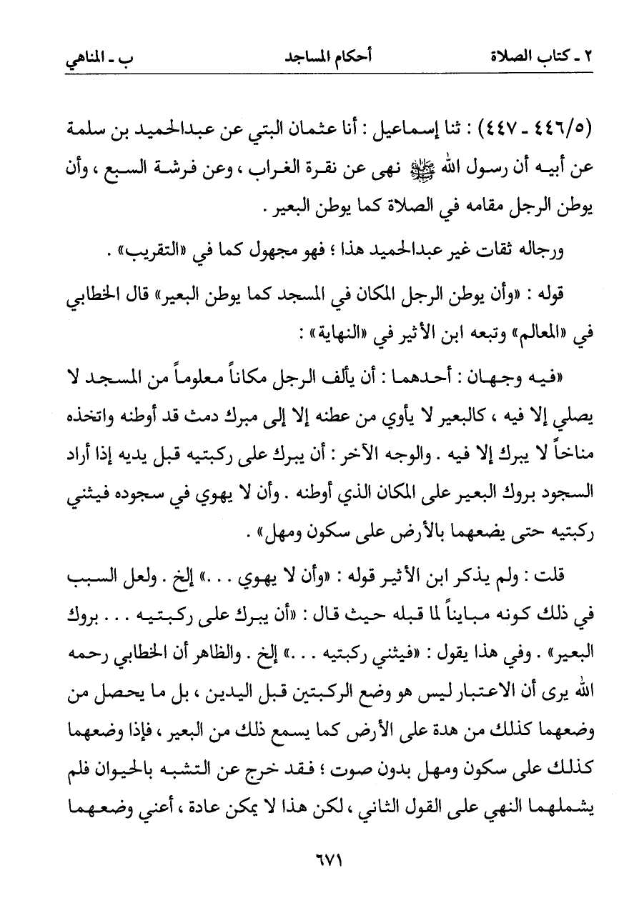 قوله: (وأن يوطن الرجل المكان في المسجد كما يوطن البعير) قال الخطابي في (المعالم) وتبعه ابن الأثير في (النهاية):