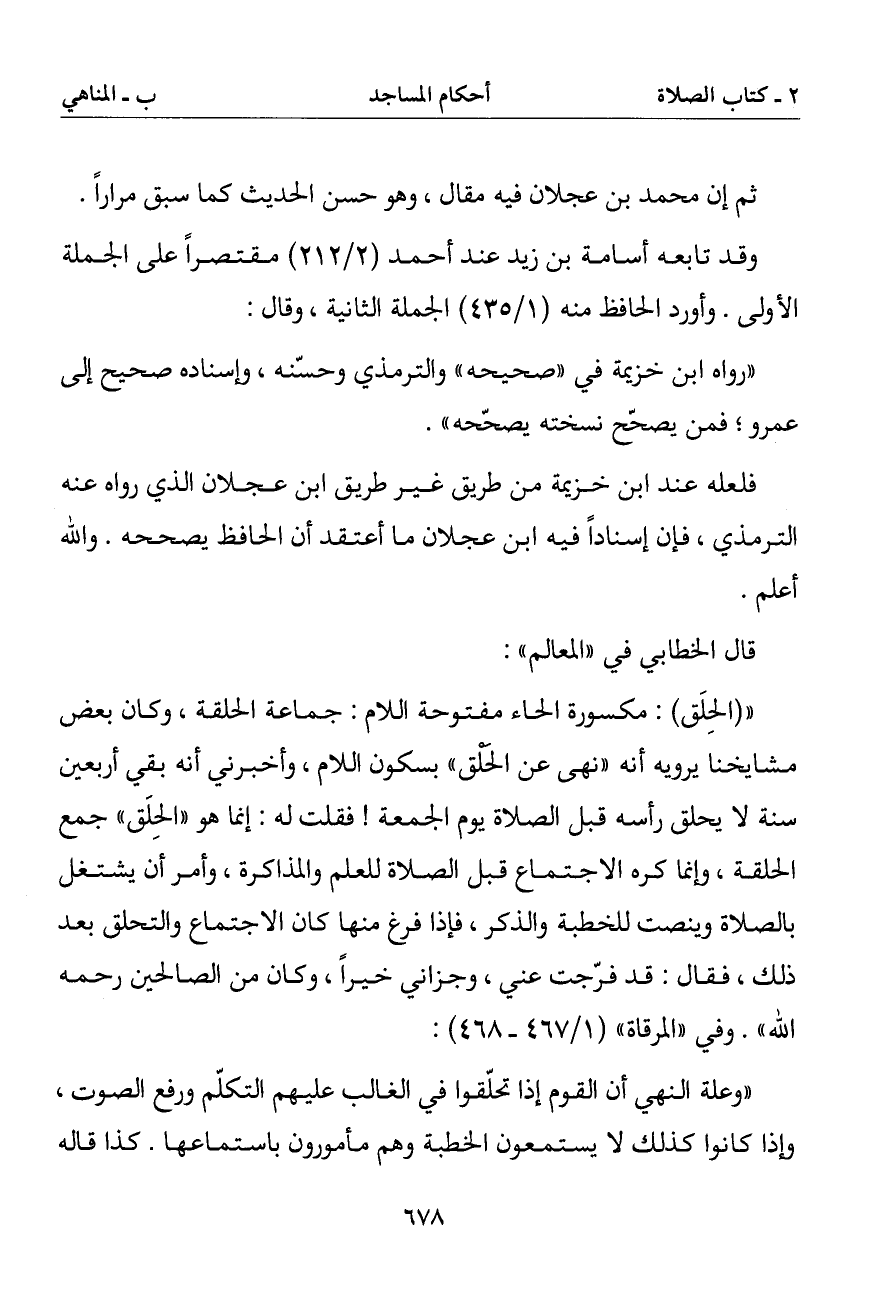 (الحلق): مكسورة الحاء مفتوحة اللام: جماعة الحلقة وكان بعض مشايخنا يرويه أنه (نهى عن الحلق) بسكون اللام وأخبرني أنه بقي أربعين سنة لا يحلق رأسه قبل الصلاة يوم الجمعة فقلت له: إنما هو (الحلق) جمع الحلقة وإنما كره الاجتماع قبل الصلاة للعلم والمذاكرة وأمر أن يشتغل بالصلاة وينصت للخطبة والذكر فإذا فرغ منها كان الاجتماع والتحلق بعد ذلك فقال: قد فرجت عني وجزاني خيرا وكان من الصالحين رحمه الله). وفي (المرقاة):