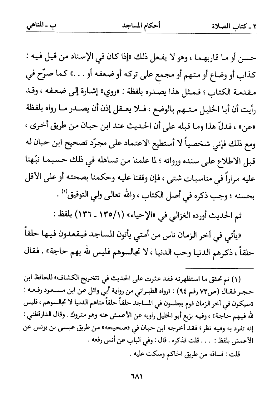 (1) ثم تحقق ما استظهرته فقد عثرت على الحديث في (تخريج الكشاف) للحافظ ابن حجر فقال (ص 73 رقم 94): (رواه الطبراني من رواية أبي وائل عن ابن مسعود رفعه: (سيكون في آخر الزمان قوم يجلسون في المساجد حلقا حلقا مناهم الدنيا لا تجالسوهم فليس لله فيهم حاجة) وفيه بزيع أبو الخليل راويه عن الأعمش عنه وهو متروك. وقال الدارقطني: إنه تفرد به وفيه نظر فقد أخرجه ابن حبان في (صحيحه) من طريق عيسى بن يونس عن الأعمش بلفظ:. . . قلت فذكره. قال: وفي الباب عن أنس رفعه