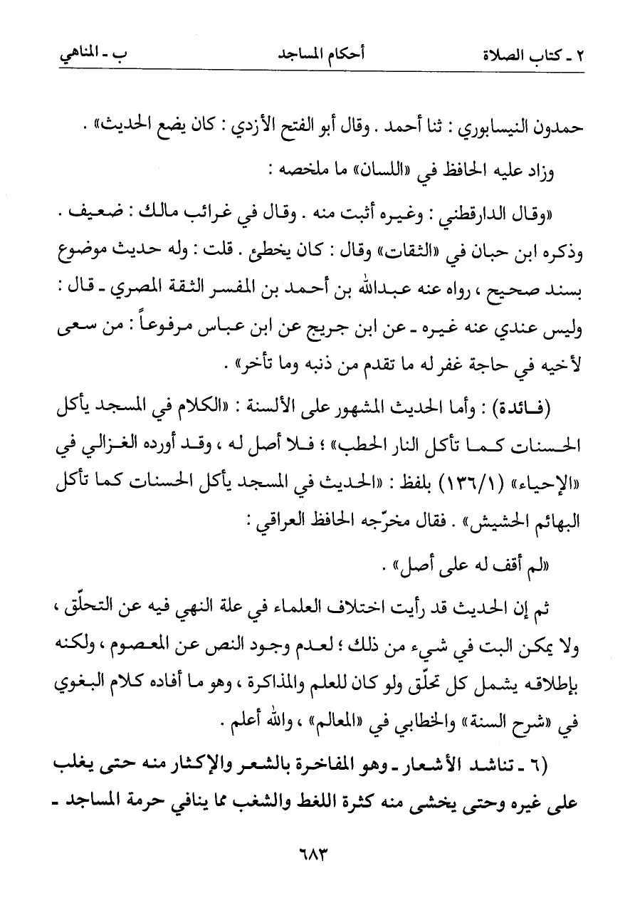 (فائدة): وأما الحديث المشهور على الألسنة: (الكلام في المسجد يأكل الحسنات كما تأكل النار الحطب) فلا أصل له وقد أورده الغزالي في (الإحياء) بلفظ: (الحديث في المسجد يأكل الحسنات كما تأكل البهائم الحشيش). فقال مخرجه الحافظ العراقي: