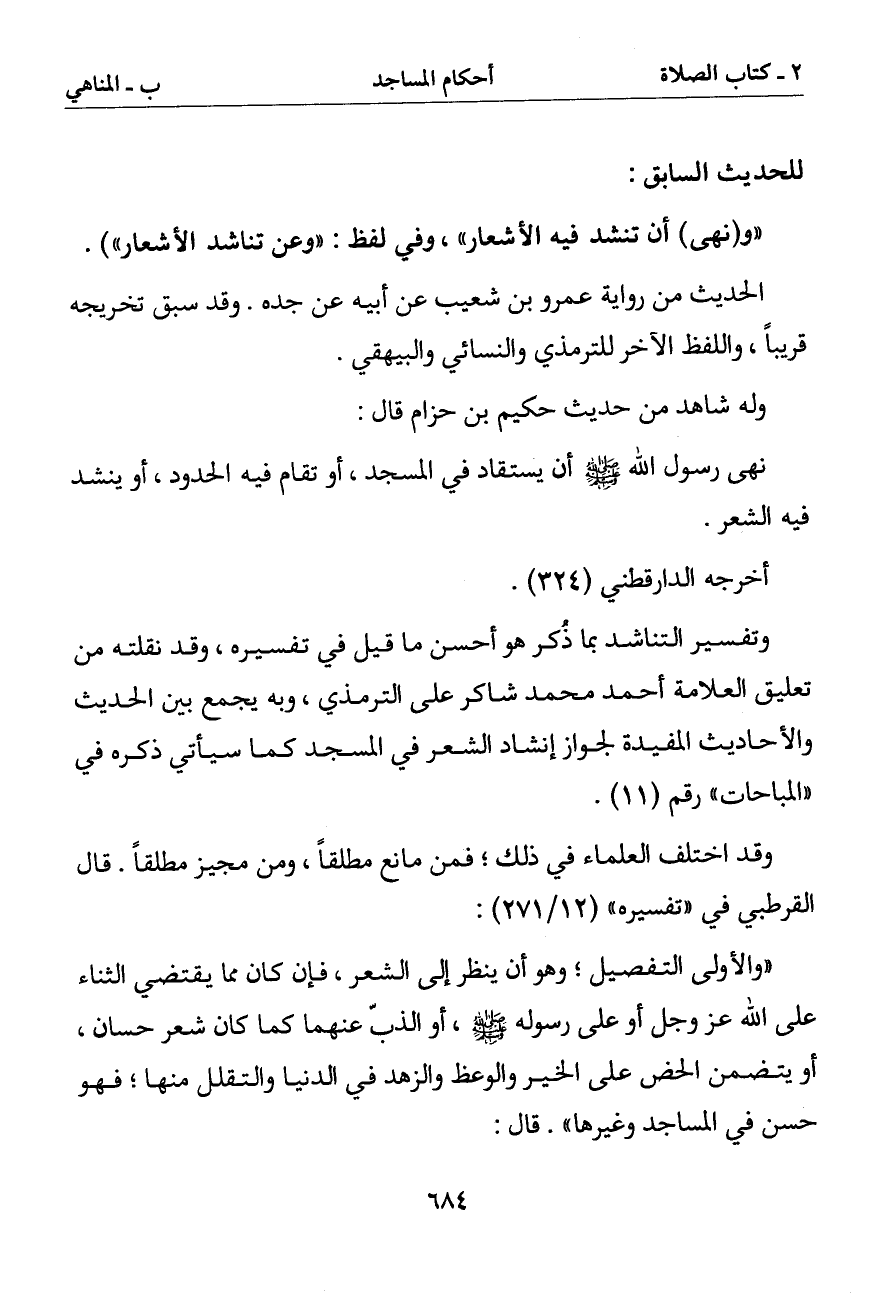 وتفسير التناشد بما ذكر هو أحسن ما قيل في تفسيره وقد نقلته من تعليق العلامة أحمد محمد شاكر على الترمذي وبه يجمع بين الحديث والأحاديث المفيدة لجواز إنشاد الشعر في المساجد كما سيأتي ذكره في (المباحات). رقم (11)