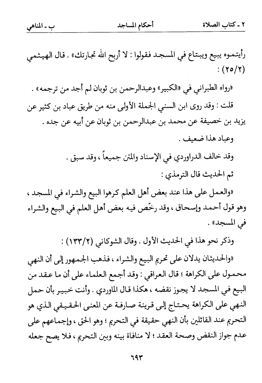 (والحديثان يدلان على تحريم البيع والشراء فذهب الجمهور إلى أن النهي محمول على الكراهة قال العراقي: وقد أجمع العلماء على أن ما عقد من البيع في المسجد لا يجوز نقضه هكذا قال الماوردي. وأنت خبير بأن حمل النهي على الكراهة يحتاج إلى قرينة صارفة عن المعنى الحقيقي الذي هو التحريم عند القائلين به بأن النهي حقيقة في التحريم وهو الحق وإجماعهم على عدم جواز النقض وصحة العقد لا منافاة بينه وبين التحريم فلا يصح جعله