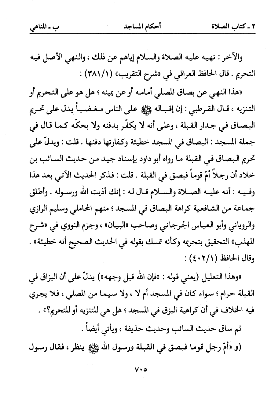 (وهذا التعليل (يعني قوله: (فإن الله قبل وجهه) يدل على أن البزاق في القبلة حرام سواء كان في المسجد أم لا ولا سيما من المصلي فلا يجري فيه الخلاف في أن كراهية البزاق في المسجد هل هي للتنزيه أو للتحريم؟)