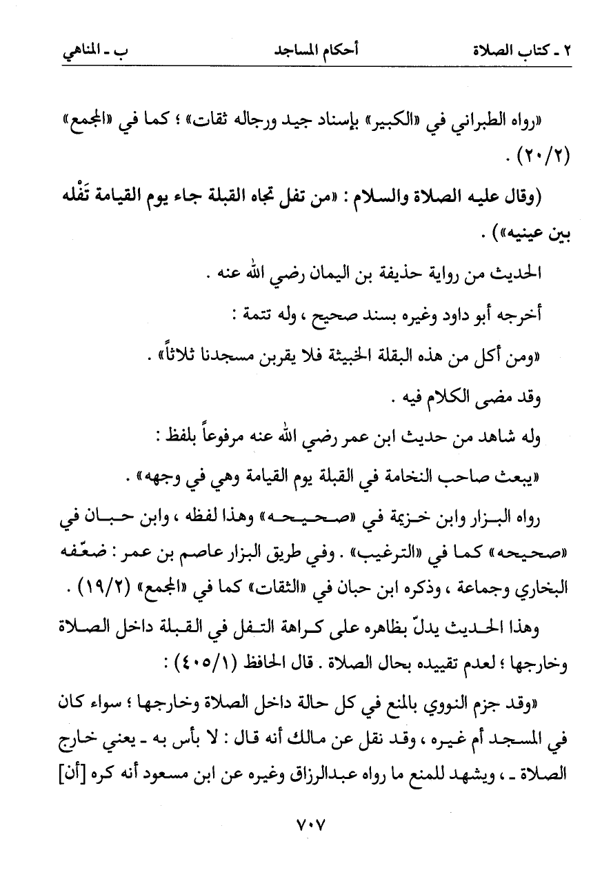 (وقال عليه الصلاة والسلام: (من تفل تجاه القبلة جاء يوم القيامة تفله بين عينيه)