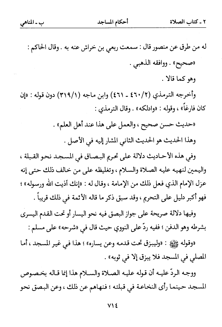 وفي هذه الأحاديث دلالة على تحريم البصاق في المسجد نحو القبلة واليمين لنهيه عليه الصلاة والسلام وتغليظه على من خالف ذلك حتى إنه عزل الإمام الذي فعل ذلك من الإمامة وقال له: (إنك آذيت الله ورسوله) فهو أكبر دليل على التحريم وقد سبق ذكر ما قاله الأئمة في ذلك قريبا