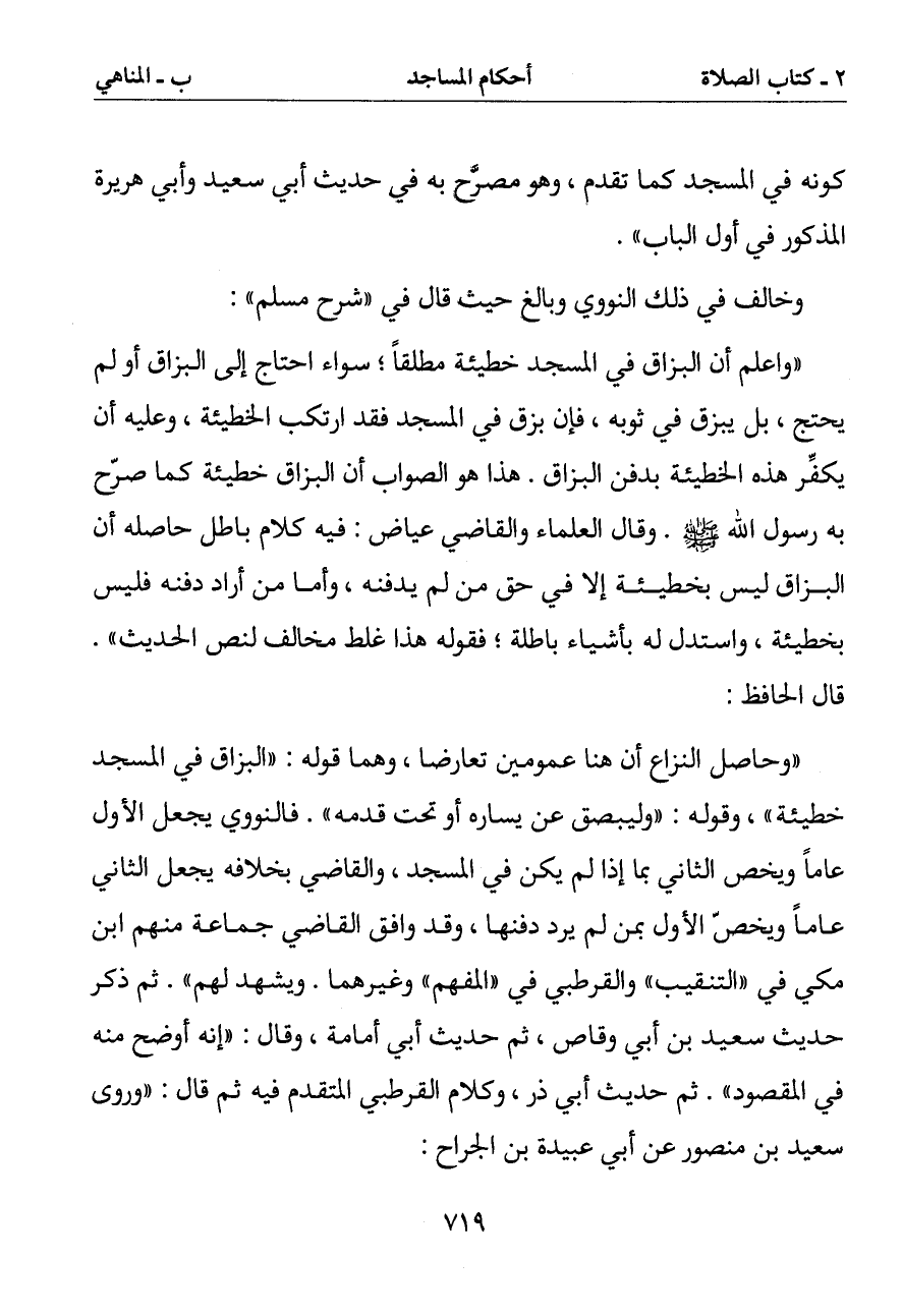 (وحاصل النزاع أن هنا عمومين تعارضا وهما قوله: (البزاق في المسجد خطيئة) وقوله: (وليبصق عن يساره أو تحت قدمه). فالنووي يجعل الأول عاما ويخص الثاني بما إذا لم يكن في المسجد والقاضي بخلافه يجعل الثاني عاما ويخص الأول بمن لم يرد دفنها وقد وافق القاضي جماعة منهم ابن مكي في (التنقيب) والقرطبي في (المفهم) وغيرهما. ويشهد لهم). ثم ذكر حديث سعيد بن أبي وقاص ثم حديث أبي أمامة وقال: (إنه أوضح منه في المقصود). ثم حديث أبي ذر وكلام القرطبي المتقدم فيه ثم قال: (وروى سعيد بن منصور عن أبي عبيدة بن الجراح: