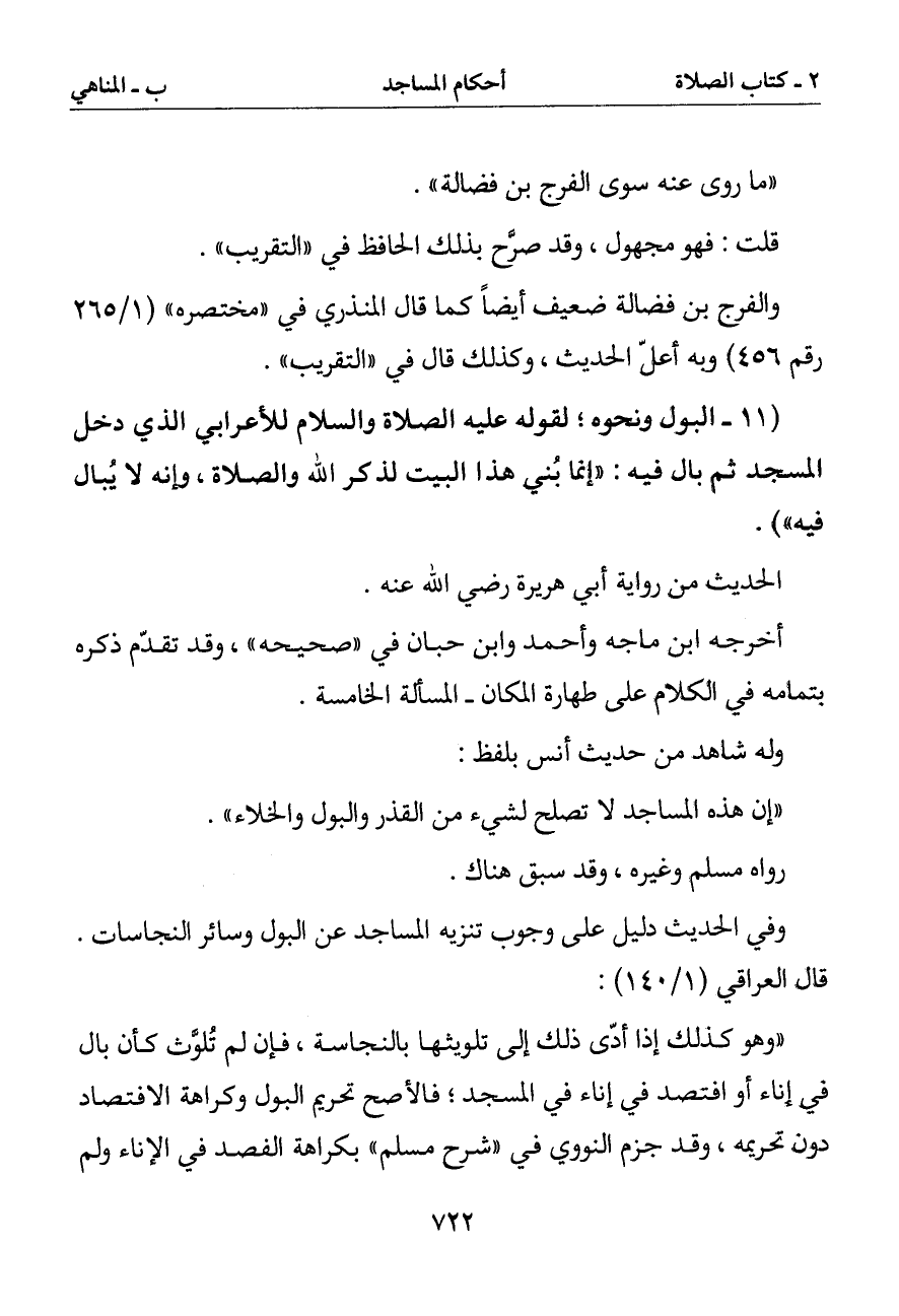 (11 - البول ونحوه لقوله عليه الصلاة والسلام للأعرابي الذي دخل المسجد ثم بال فيه: (إنما بني هذا البيت لذكر الله والصلاة وإنه لا يبال فيه)