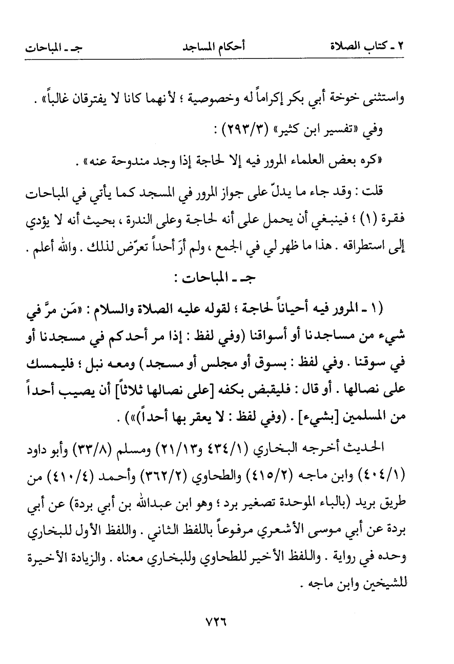 قلت: وقد جاء ما يدل على جواز المرور في المسجد كما يأتي في المباحات فقرة (1) فينبغي أن يحمل على أنه لحاجة وعلى الندرة بحيث أنه لا يؤدي إلى استطراقه. هذا ما ظهر لي في الجمع ولم أر أحدا تعرض لذلك. والله أعلم