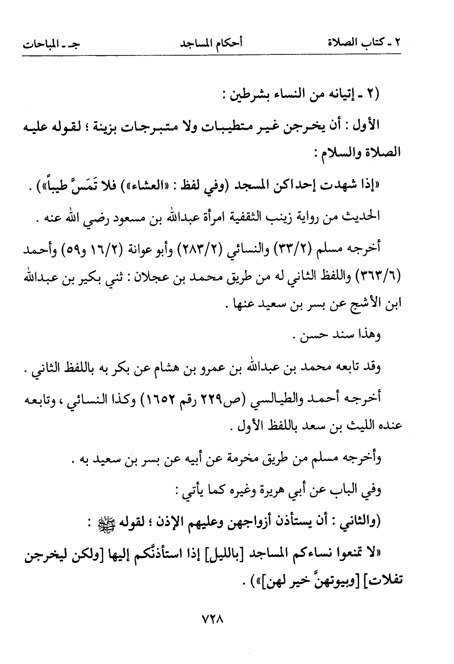 الأول: أن يخرجن غير متطيبات ولا متبرجات بزينة لقوله عليه الصلاة والسلام: