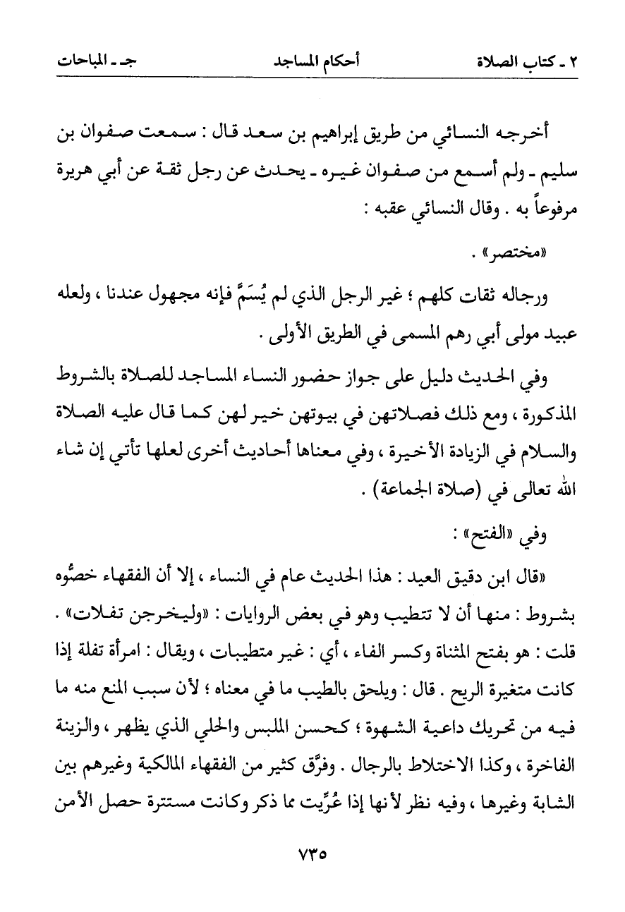 (قال ابن دقيق العيد: هذا الحديث عام في النساء إلا أن الفقهاء خصوه بشروط: منها أن لا تتطيب وهو في بعض الروايات: (وليخرجن تفلات). قلت: هو بفتح المثناة وكسر الفاء أي: غير متطيبات ويقال: امرأة تفلة إذا كانت متغيرة الريح. قال: ويلحق بالطيب ما في معناه لأن سبب المنع منه ما فيه من تحريك داعية الشهوة كحسن الملبس والحلي الذي يظهر والزينة الفاخرة وكذا الاختلاط بالرجال. وفرق كثير من الفقهاء المالكية وغيرهم بين الشابة وغيرها وفيه نظر لأنها إذا عريت مما ذكر وكانت مستترة حصل الأمن