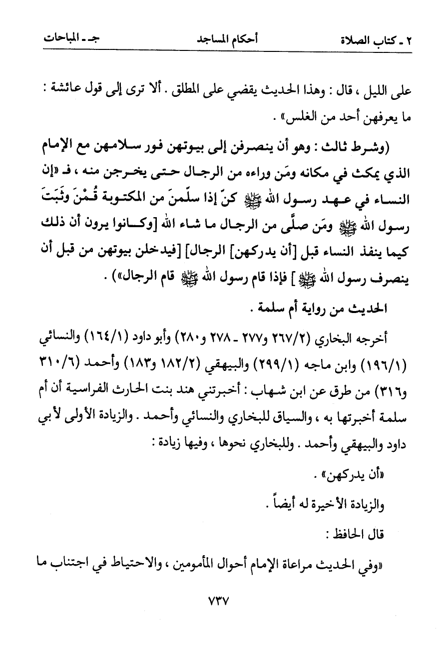 (وشرط ثالث: وهو أن ينصرفن إلى بيوتهن فور سلامهن مع الإمام الذي يمكث في مكانه ومن وراءه من الرجال حتى يخرجن منه ف (إن النساء في عهد رسول الله صلى الله عليه وسلم كن إذا سلمن من المكتوبة قمن وثبت رسول الله صلى الله عليه وسلم ومن صلى من الرجال ما شاء الله [وكانوا يرون أن ذلك كيما ينفذ النساء قبل [أن يدركهن] الرجال] [فيدخلن بيوتهن من قبل أن ينصرف رسول الله صلى الله عليه وسلم] فإذا قام رسول الله صلى الله عليه وسلم قام الرجال)