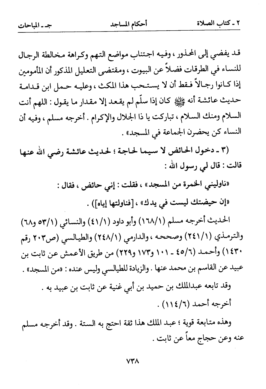 (3 - دخول الحائض لا سيما لحاجة لحديث عائشة رضي الله عنه قالت: قال لي رسول الله: