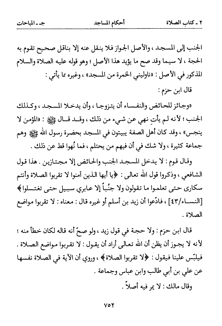 قال ابن حزم: ولا حجة في قول زيد ولو صح أنه قاله لكان خطأ منه لأنه لا يجوز أن يظن أن الله تعالى أراد أن يقول: لا تقربوا مواضع الصلاة. فيلبس علينا قوله فيقول: {لا تقربوا الصلاة} وروي أن الآية في الصلاة نفسها عن علي بن أبي طالب وابن عباس وجماعة