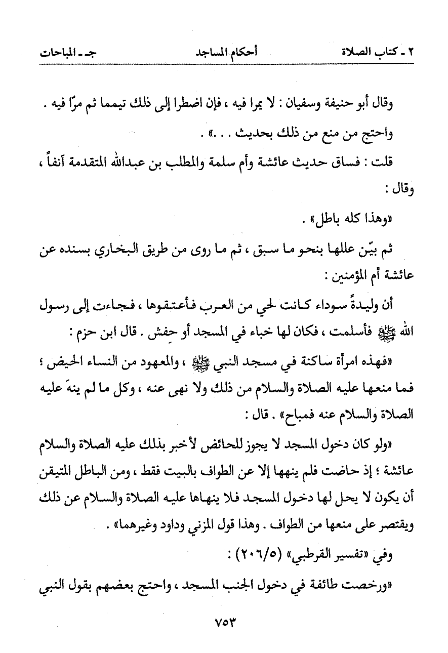 (ولو كان دخول المسجد لا يجوز للحائض لأخبر بذلك عليه الصلاة والسلام عائشة إذ حاضت فلم ينهها إلا عن الطواف بالبيت فقط ومن الباطل المتيقن أن يكون لا يحل لها دخول المسجد فلا ينهاها عليه الصلاة والسلام عن ذلك ويقتصر على منعها من الطواف. وهذا قول المزني وداود وغيرهما)