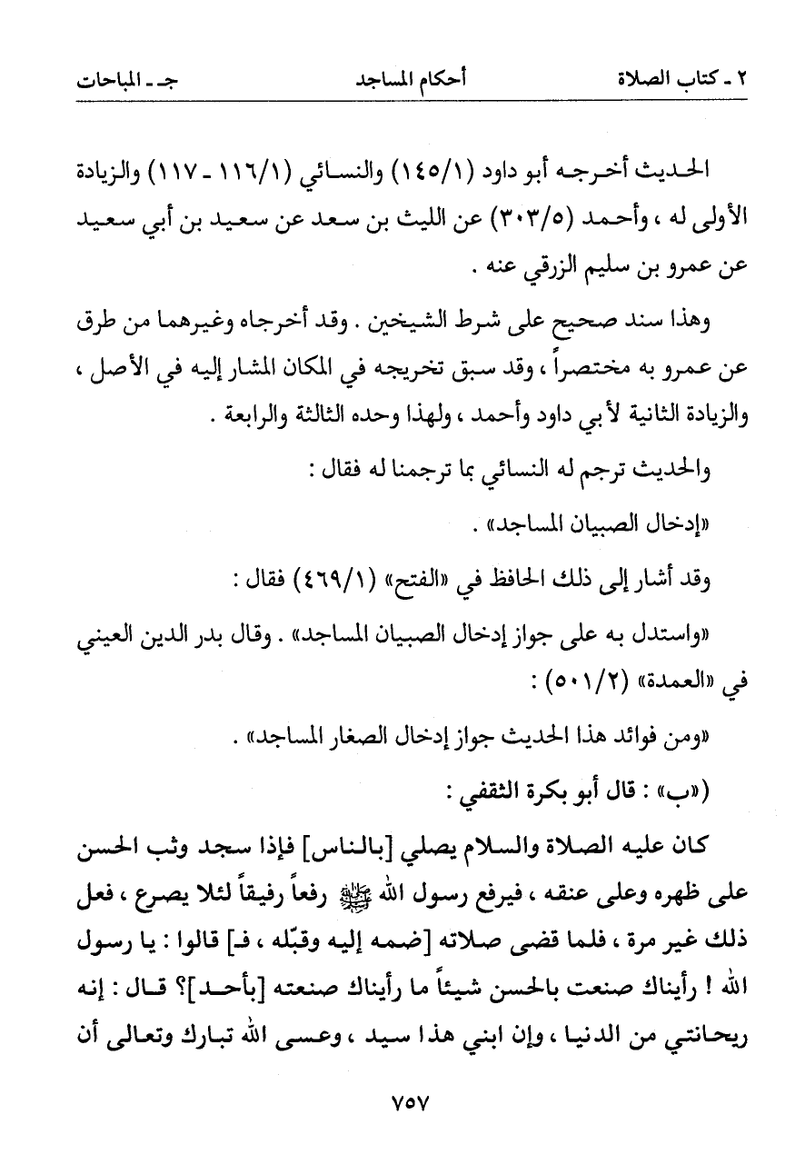 (واستدل به على جواز إدخال الصبيان المساجد). وقال بدر الدين العيني في (العمدة):