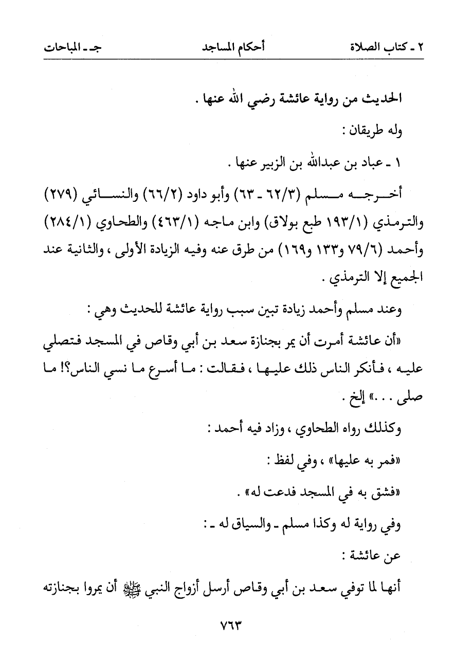 (أن عائشة أمرت أن يمر بجنازة سعد بن أبي وقاص في المسجد فتصلي عليه فأنكر الناس ذلك عليها فقالت: ما أسرع ما نسي الناس؟ ما صلى. . . .) إلخ