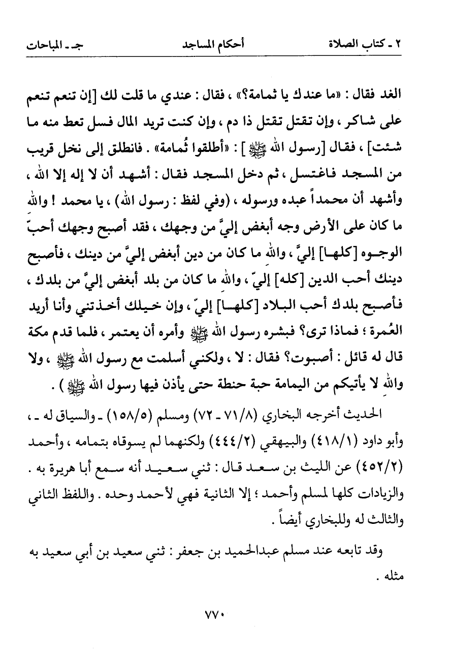 الغد فقال: (ما عندك يا ثمامة؟) فقال: عندي ما قلت لك [إن تنعم تنعم على شاكر وإن تقتل تقتل ذا دم وإن كنت تريد المال فسل تعط منه ما شئت] فقال [رسول الله صلى الله عليه وسلم]: (أطلقوا ثمامة). فانطلق إلى نخل قريب من المسجد فاغتسل ثم دخل المسجد فقال: أشهد أن لا إله إلا الله وأشهد أن محمدا عبده ورسوله (وفي لفظ يارسول الله) يا محمد والله ما كان على الأرض وجه أبغض إلي من وجهك فقد أصبح وجهك أحب الوجوه [كلها] إلي والله ما كان من دين أبغض إلي من دينك فأصبح دينك أحب الدين [كله] إلي والله ما كان من بلد أبغض إلي من بلدك فأصبح بلدك أحب البلاد [كلها] إلي وإن خيلك أخذتني وأنا أريد العمرة فماذا ترى؟ فبشره رسول الله صلى الله عليه وسلم وأمره أن يعتمر فلما قدم مكة قال له قائل: أصبوت؟ فقال: لا ولكني أسلمت مع رسول الله صلى الله عليه وسلم ولا والله لا يأتيكم من اليمامة حبة حنطة حتى يأذن فيها رسول الله صلى الله عليه وسلم)