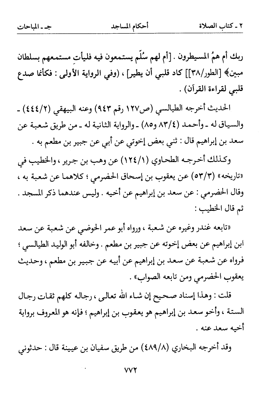 (تابعه غندر وغيره عن شعبة ورواه أبو عمر الحوضي عن شعبة عن سعد ابن إبراهيم عن بعض إخوته عن جبير بن مطعم. وخالفه أبو الوليد الطيالسي فرواه عن شعبة عن سعد بن إبراهيم عن جبير بن مطعم وحديث يعقوب الحضرمي ومن تابعه الصواب)