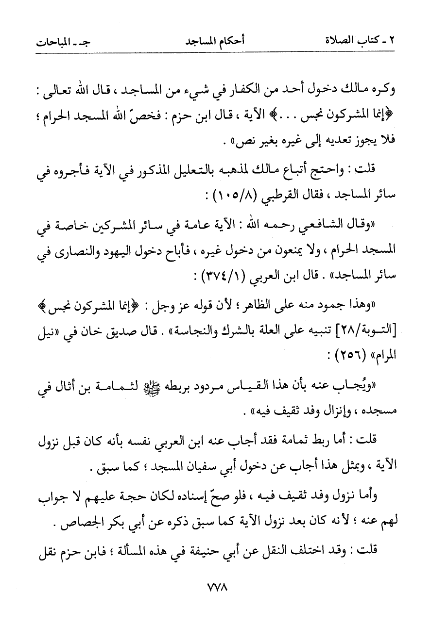 قلت: أما ربط ثمامة فقد أجاب عنه ابن العربي نفسه بأنه كان قبل نزول الآية وبمثل هذا أجاب عنه ابن العربي نفسه كان قبل نزول الآية وبمثل هذا أجاب عن دخول أبي سفيان المسجد كما سبق