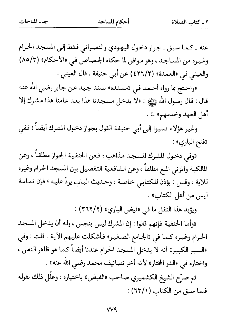 (واحتج بما رواه أحمد في (مسنده) بسند جيد عن جابر رضي الله عنه قال: قال رسول الله صلى الله عليه وسلم: (لا يدخل مسجدنا هذا بعد عامنا هذا مشرك إلا أهل العهد وخدمهم).)
