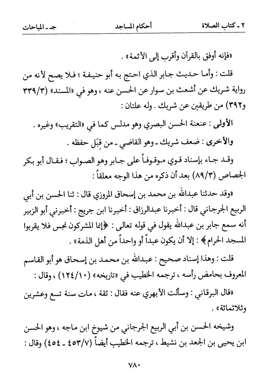(وقد حدثنا عبد الله بن محمد بن إسحاق المروزي قال: ثنا الحسن بن أبي الربيع الجرجاني قال: أخبرنا عبد الرزاق: أخبرنا ابن جريج: أخبرني أبو الزبير أنه سمع جابر بن عبد الله يقول في قوله تعالى: {إنما المشركون نجس فلا يقربوا المسجد الحرام}: إلا أن يكون عبدا أو واحدا من أهل الذمة)