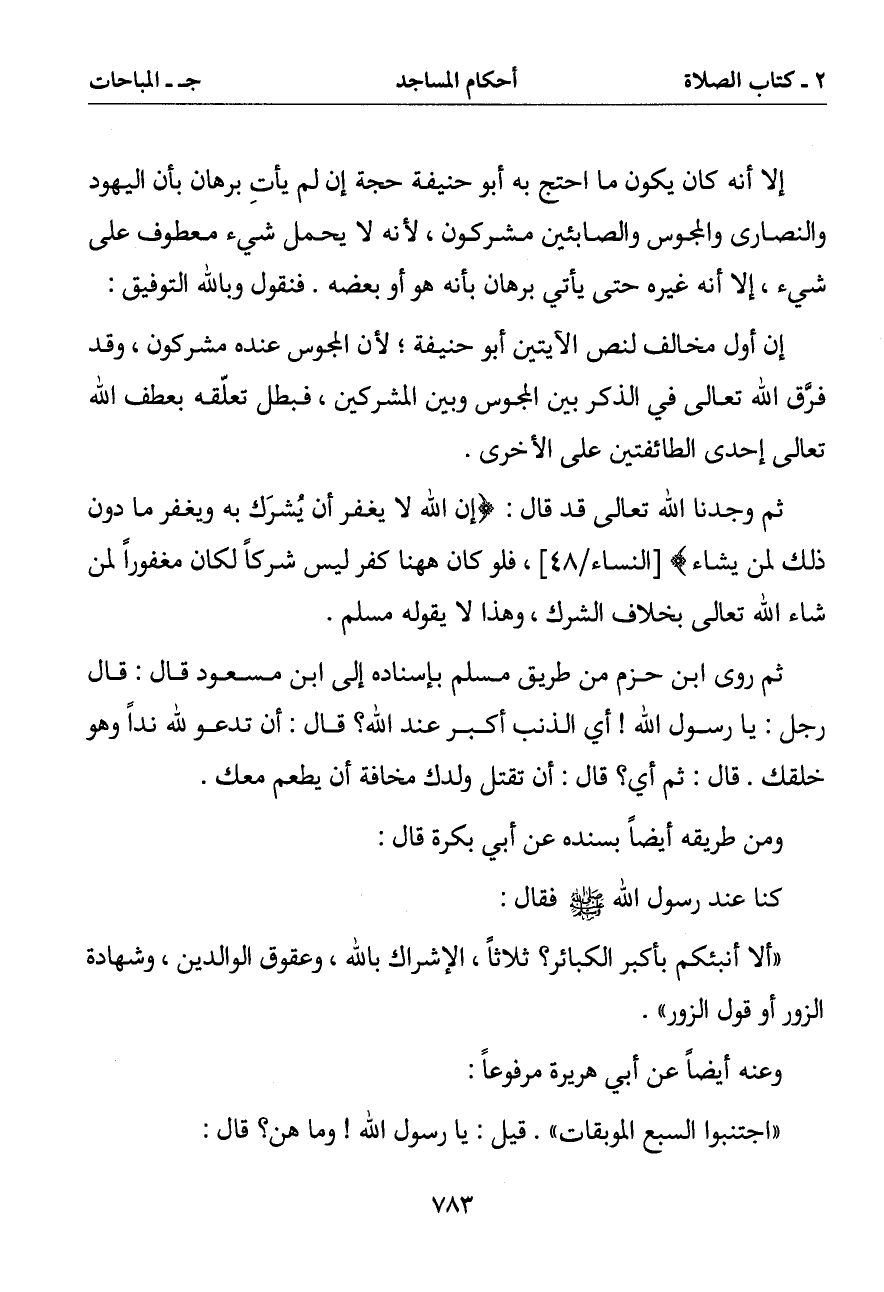 إلا أنه كان يكون ما احتج به أبو حنيفة حجة إن لم يأت برهان بأن اليهود والنصارى والمجوس والصابئين مشركون لأنه لا يحمل شيء معطوف على شيء إلا أنه غيره حتى يأتي برهان بأنه هو أو بعضه. فنقول وبالله التوفيق: