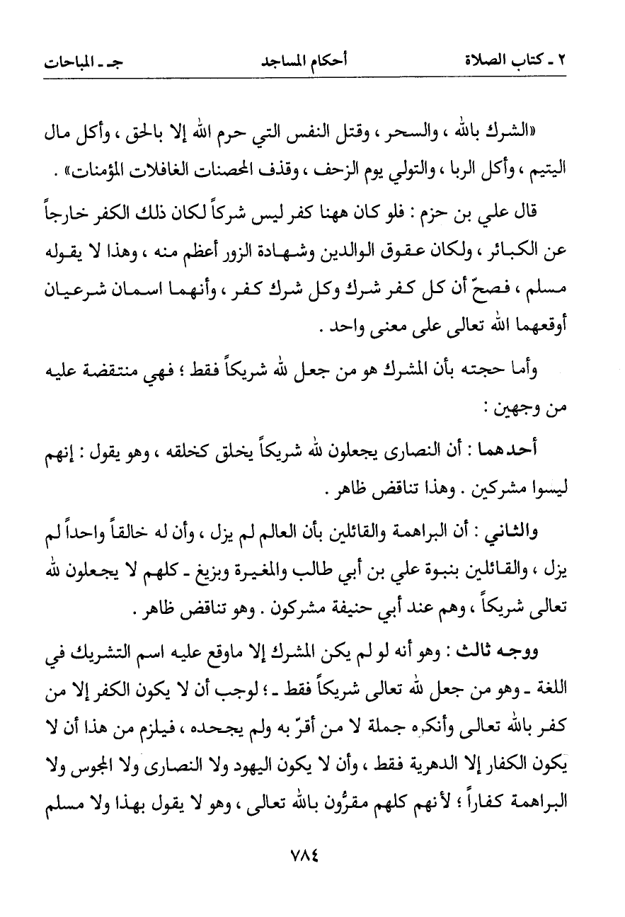قال علي بن حزم: فلو كان ههنا كفر ليس شركا لكان ذلك الكفر خارجا عن الكبائر ولكان عقوق الوالدين وشهادة الزور أعظم منه وهذا لا يقوله مسلم فصح أن كل كفر شرك وكل شرك كفر وأنهما اسمان شرعيان أوقعهما الله تعالى على معنى واحد