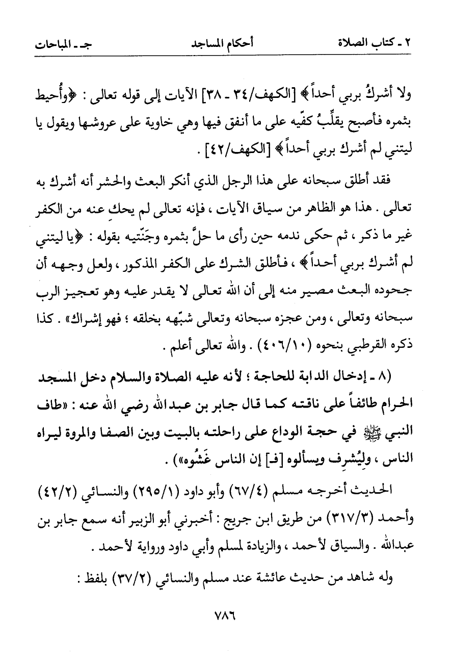 (8 - إدخال الدابة للحاجة لأنه عليه الصلاة والسلام دخل المسجد الحرام طائفا على ناقته كما قال جابر بن عبد الله رضي الله عنه: (طاف النبي صلى الله عليه وسلم في حجة الوداع على راحلته بالبيت وبين الصفا والمروة ليراه الناس وليشرف ويسألوه [ف] إن الناس غشوه)