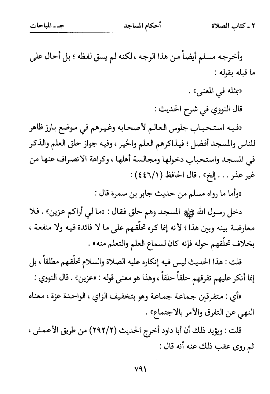 دخل رسول الله صلى الله عليه وسلم المسجد وهم حلق فقال: (ما لي أراكم عزين). فلا معارضة بينه وبين هذا لأنه إنما كره تحلقهم على ما لا فائدة فيه ولا منفعة بخلاف تحلقهم حوله فإنه كان لسماع العلم والتعلم منه)