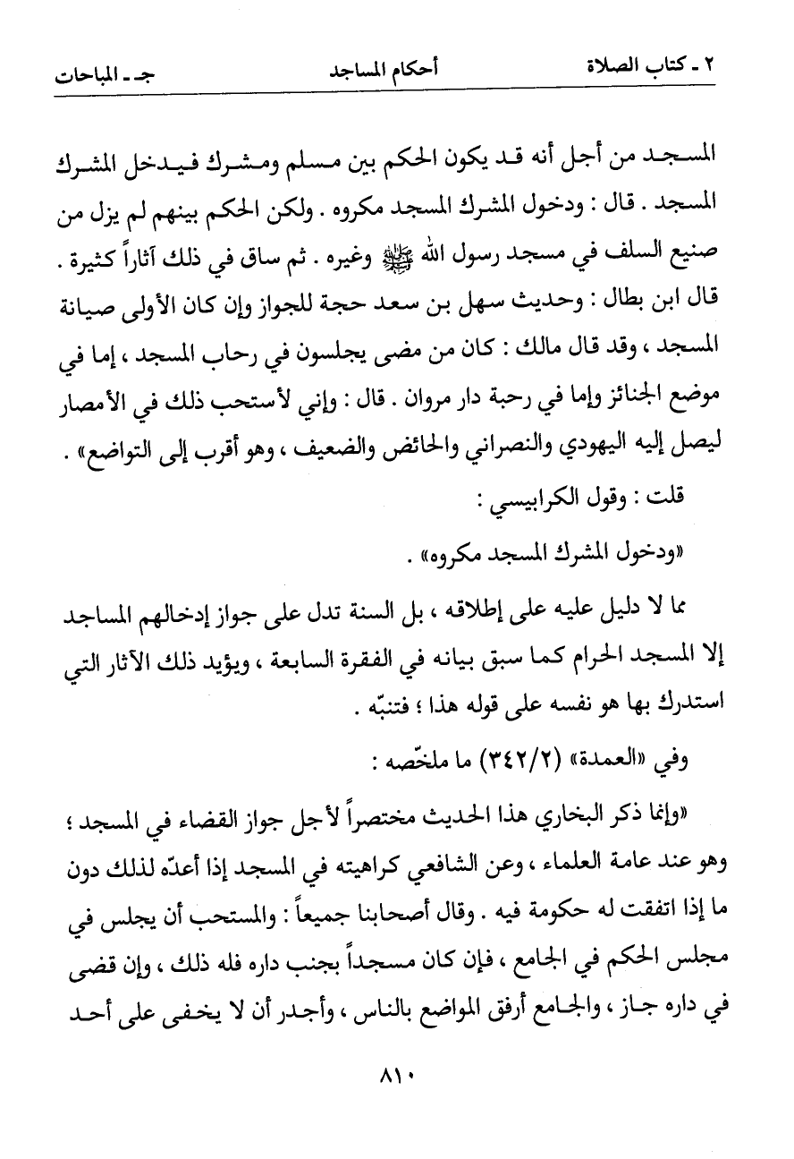 المسجد من أجل أنه قد يكون الحكم بين مسلم ومشرك فيدخل المشرك المسجد. قال: ودخول المشرك المسجد مكروه. ولكن الحكم بينهم لم يزل من صنيع السلف في مسجد رسول الله صلى الله عليه وسلم وغيره. ثم ساق في ذلك أثارا كثيرة. قال ابن بطال: وحديث سهل بن سعد حجة للجواز وإن كان الأولى صيانة المسجد وقد قال مالك: كان من مضى يجلسون في رحاب المسجد إما في موضع الجنائز وإما في رحبة دار مروان قال: وإني لأستحب ذلك في الأمصار ليصل إليه اليهودي والنصراني والحائض والضعيف وهو أقرب إلى التواضع)