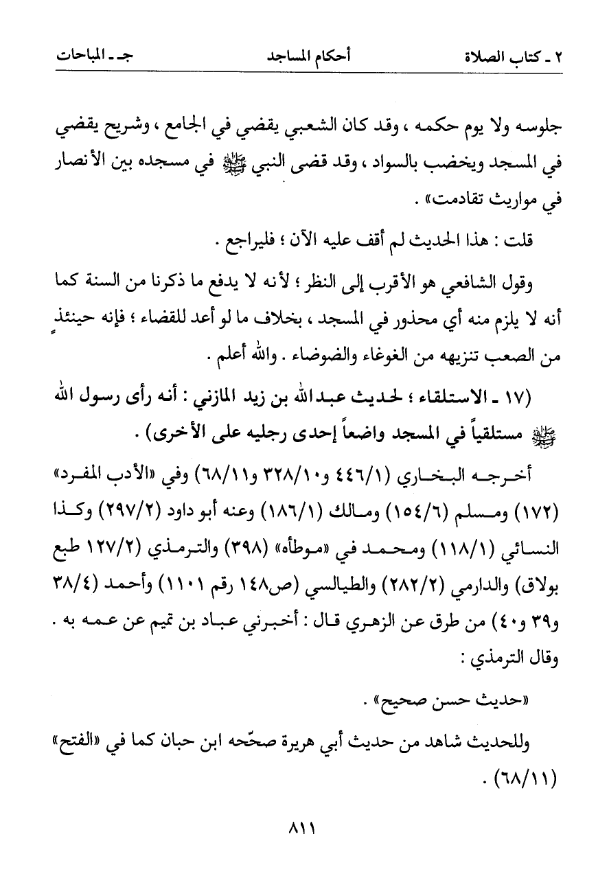 (17 - الاستلقاء لحديث عبد الله بن زيد المازني: أنه رأى رسول الله صلى الله عليه وسلم مستلقيا في المسجد واضعا إحدى رجليه على الأخرى)
