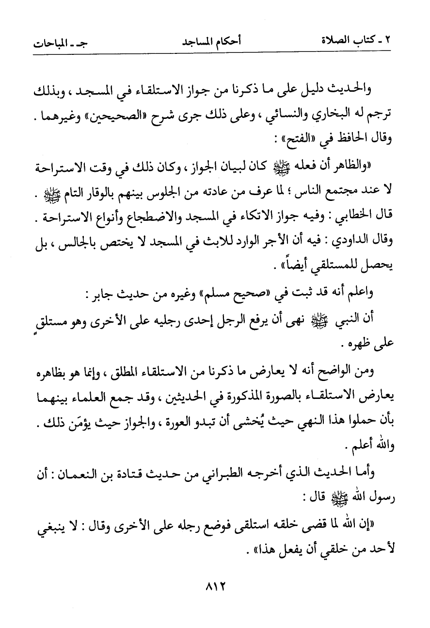 والحديث دليل على ما ذكرنا من جواز الاستلقاء في المسجد وبذلك ترجم له البخاري والنسائي وعلى ذلك جرى شرح (الصحيحين) وغيرهما. وقال الحافظ في (الفتح):