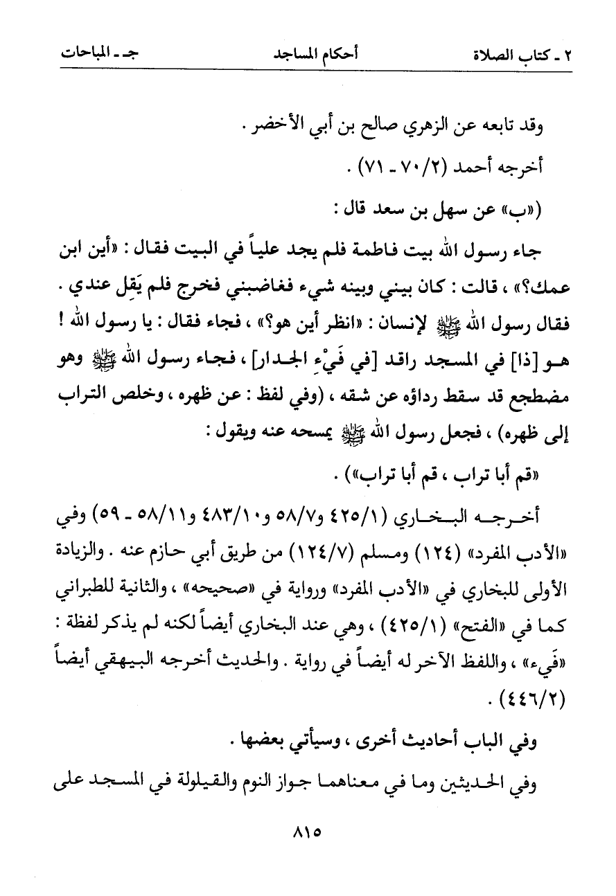 جاء رسول الله ببيت فاطمة فلم يجد عليا في البيت فقال: (أين ابن عمك؟) قالت: كان بيني وبينه شيء فغاضبني فخرج فلم يقل عندي. فقال رسول الله صلى الله عليه وسلم لإنسان: (انظر أين هو؟) فجاء فقال: يا رسول الله هو [ذا] في المسجد راقد [في فيء الجدار] فجاء رسول الله صلى الله عليه وسلم وهو مضطجع قد سقط رداؤه عن شقه (وفي لفظ: عن ظهره وخلص التراب إلى ظهره) فجعل رسول الله صلى الله عليه وسلم يمسحه عنه ويقول: