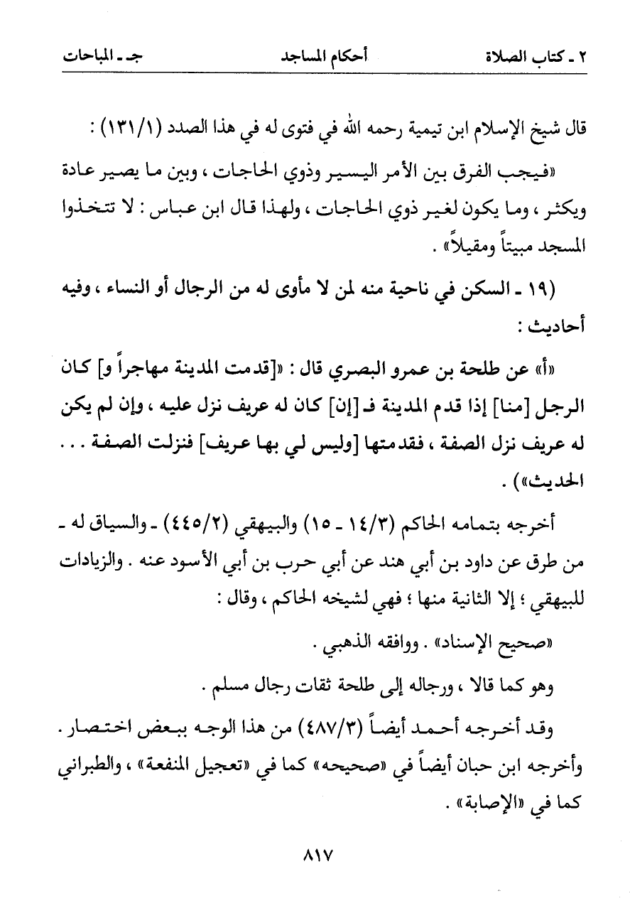 (فيجب الفرق بين الأمر اليسير وذوي الحاجات وبين ما يصير عادة ويكثر وما يكون لغير ذوي الحاجات ولهذا قال ابن عباس: لا تتخذوا المسجد مبيتا ومقيلا)