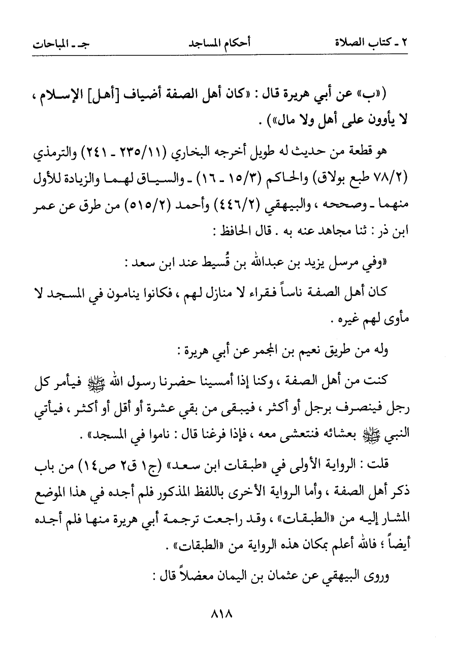 (ب) عن أبي هريرة قال: (كان أهل الصفة أضياف [أهل] الإسلام لا يأوون على أهل ولا مال)