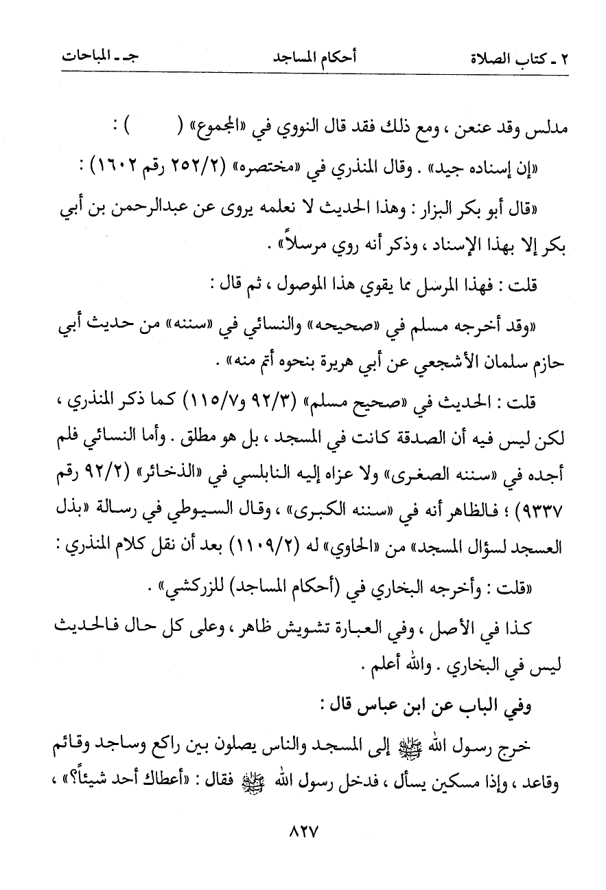 قلت: الحديث في (صحيح مسلم) كما ذكر المنذري لكن ليس فيه أن الصدقة كانت في المسجد بل هو مطلق. وأما النسائي فلم أجده في (سننه الصغرى) ولا عزاه إليه النابلسي في (الذخائر) فالظاهر أنه في (سننه الكبرى) وقال السيوطي في رسالة (بذل العسجد لسؤال المسجد) من (الحاوي) له بعد أن نقل كلام المنذري: