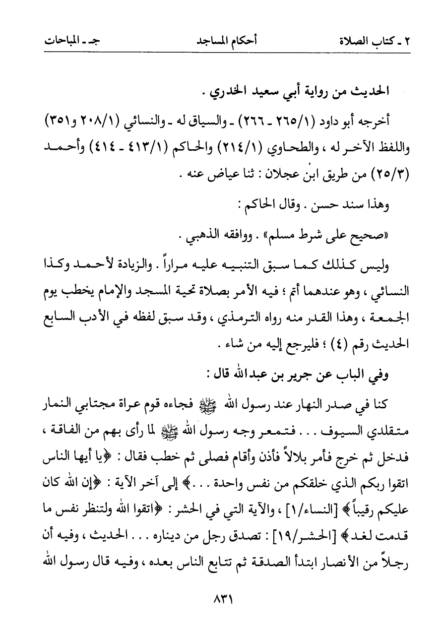 وليس كذلك كما سبق التنبيه عليه مرارا. والزيادة لأحمد وكذا النسائي وهو عندهما أتم فيه الأمر بصلاة تحية المسجد والإمام يخطب يوم الجمعة وهذا القدر منه رواه الترمذي وقد سبق لفظه في الأدب السابع الحديث رقم (4) فليرجع إليه من شاء