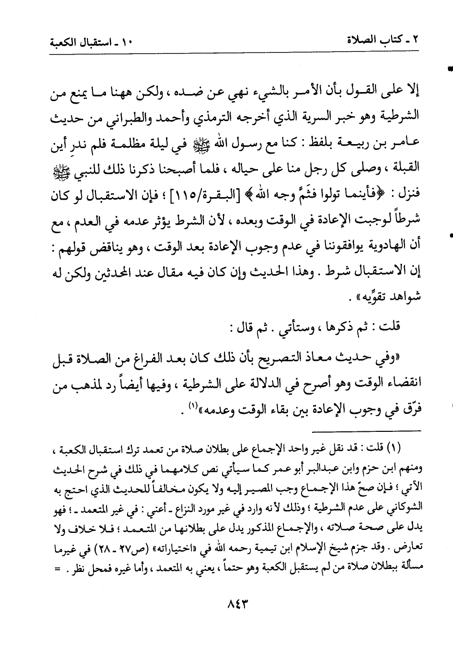 (1) قلت: قد نقل غير واحد الإجماع على بطلان صلاة من تعمد ترك استقبال الكعبة ومنهم ابن حزم وابن عبد البر أبو عمر كما سيأتي نص كلامهما في ذلك في شرح الحديث الآتي فإن صح هذا الإجماع وجب المصير إليه ولا يكون مخالفا للحديث الذي احتج به الشوكاني على عدم الشرطية وذلك لأنه وارد في غير مورد النزاع - أعني: في غير المتعمد - فهو يدل على صحة صلاته والإجماع المذكور يدل على بطلانها من المتعمد فلا خلاف ولا تعارض. وقد جزم شيخ الإسلام ابن تيمية رحمه الله في (اختياراته) (ص 27 - 28) في غير ما مسألة ببطلان صلاة من لم يستقبل الكعبة وهو حتما يعني به المتعمد وأما غيره فمحل نظر =