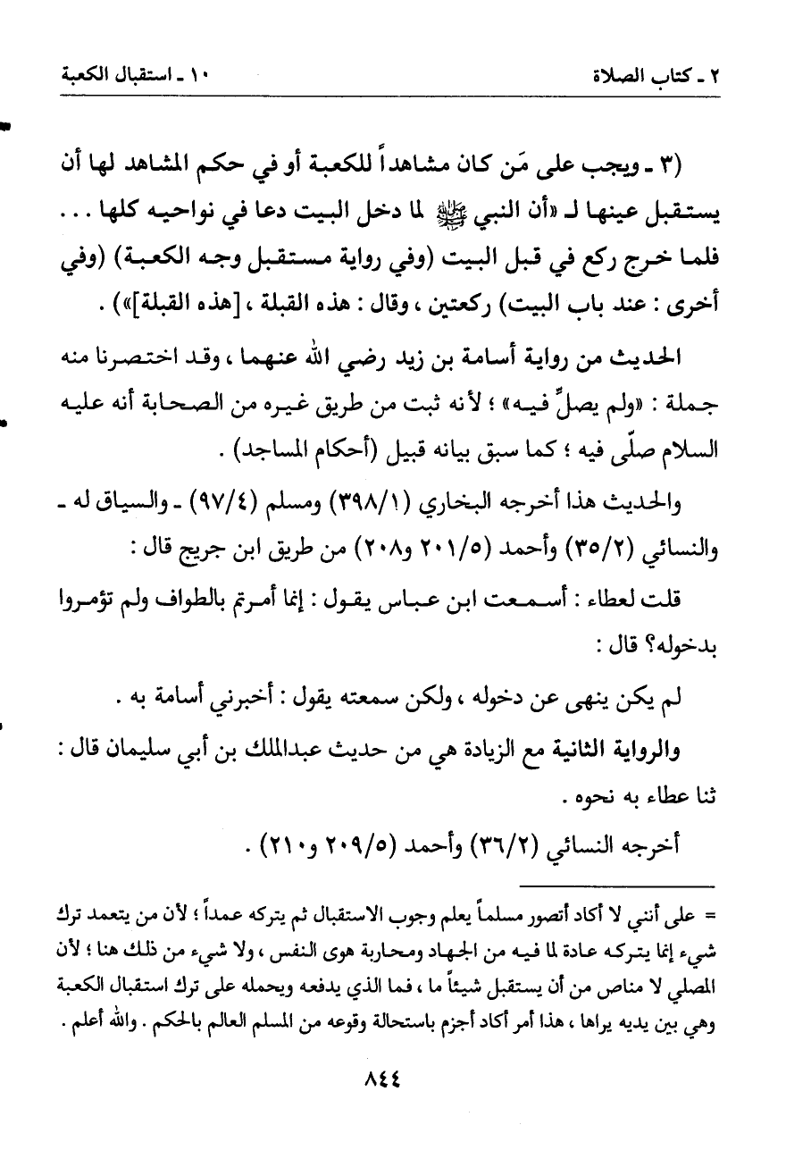 (3 - ويجب على من كان مشاهدا للكعبة أو في حكم المشاهد لها أن يستقبل عينها ل (أن النبي صلى الله عليه وسلم لما دخل البيت دعا في نواحيه كلها. . . فلما خرج ركع في قبل البيت (وفي رواية مستقبل وجه الكعبة) (وفي أخرى: عند باب البيت) ركعتين وقال: هذه القبلة [هذه القبلة])]