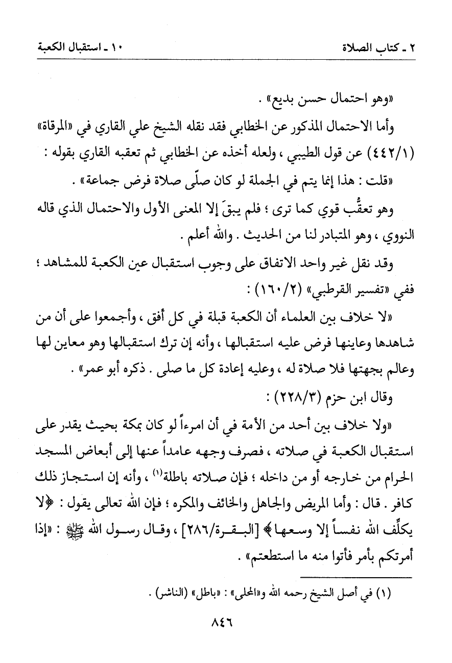 (ولا خلاف بين أحد من الأمة في أن امرءا لو كان بمكة بحيث يقدر على استقبال الكعبة في صلاته فصرف وجهه عامدا عنها إلى أبعاض المسجد الحرام من خارجه أو من داخله فإن صلاته باطلة (1) وأنه إن استجاز ذلك كافر. قال: وأما المريض والجاهل والخائف والمكره فإن الله تعالى يقول: {لا يكلف الله نفسا إلا وسعها} [البقرة / 286] وقال رسول الله صلى الله عليه وسلم: (إذا أمرتكم بأمر فأتوا منه ما استطعتم)