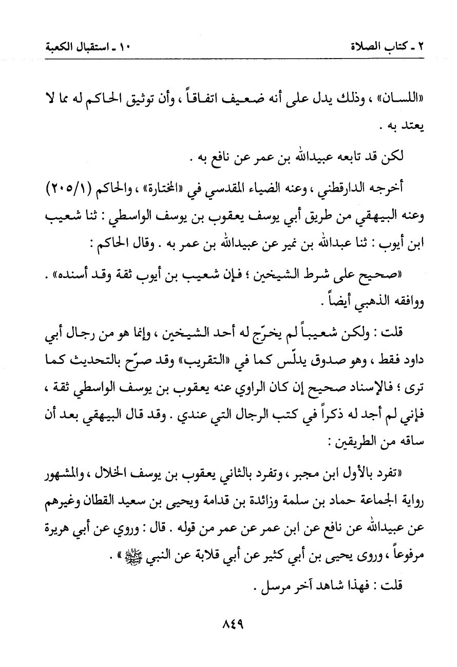 أخرجه الدارقطني وعنه الضياء المقدسي في (المختارة) والحاكم وعنه البيهقي من طريق أبي يوسف يعقوب بن يوسف الواسطي: ثنا شعيب ابن أيوب: ثنا عبد الله بن نمير عن عبيد الله بن عمر به. وقال الحاكم: