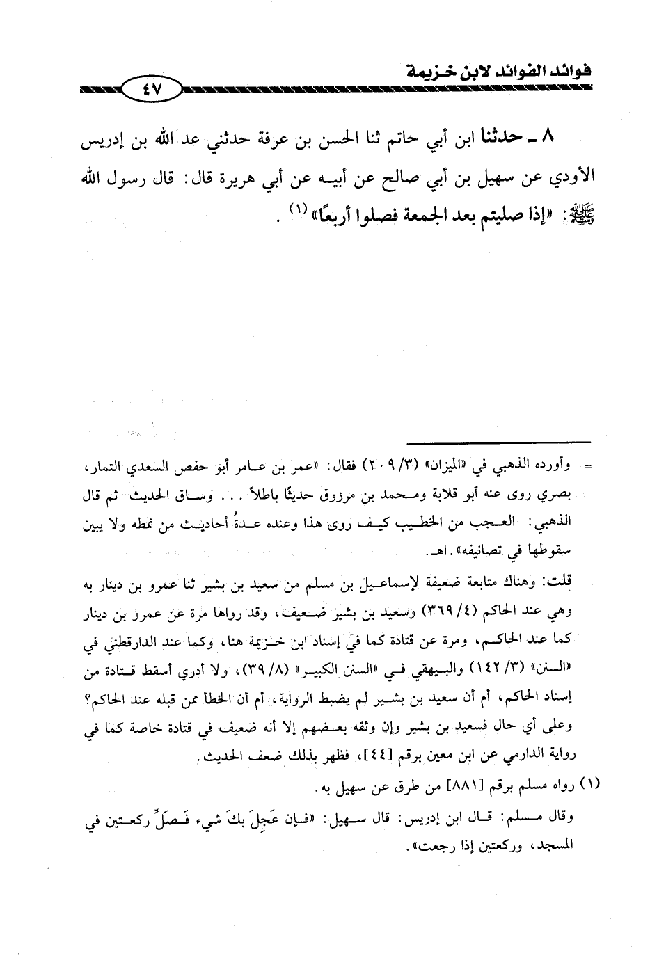 8 - حدثنا ابن أبي حاتم ثنا الحسن بن عرفة حدثني عبد الله بن إدريس الأودي عن سهيل بن أبي صالح عن أبيه عن أبي هريرة قال: قال رسول الله صلى الله عليه وسلم: ((إذا صليتم بعد الجمعة فصلوا أربعا)).