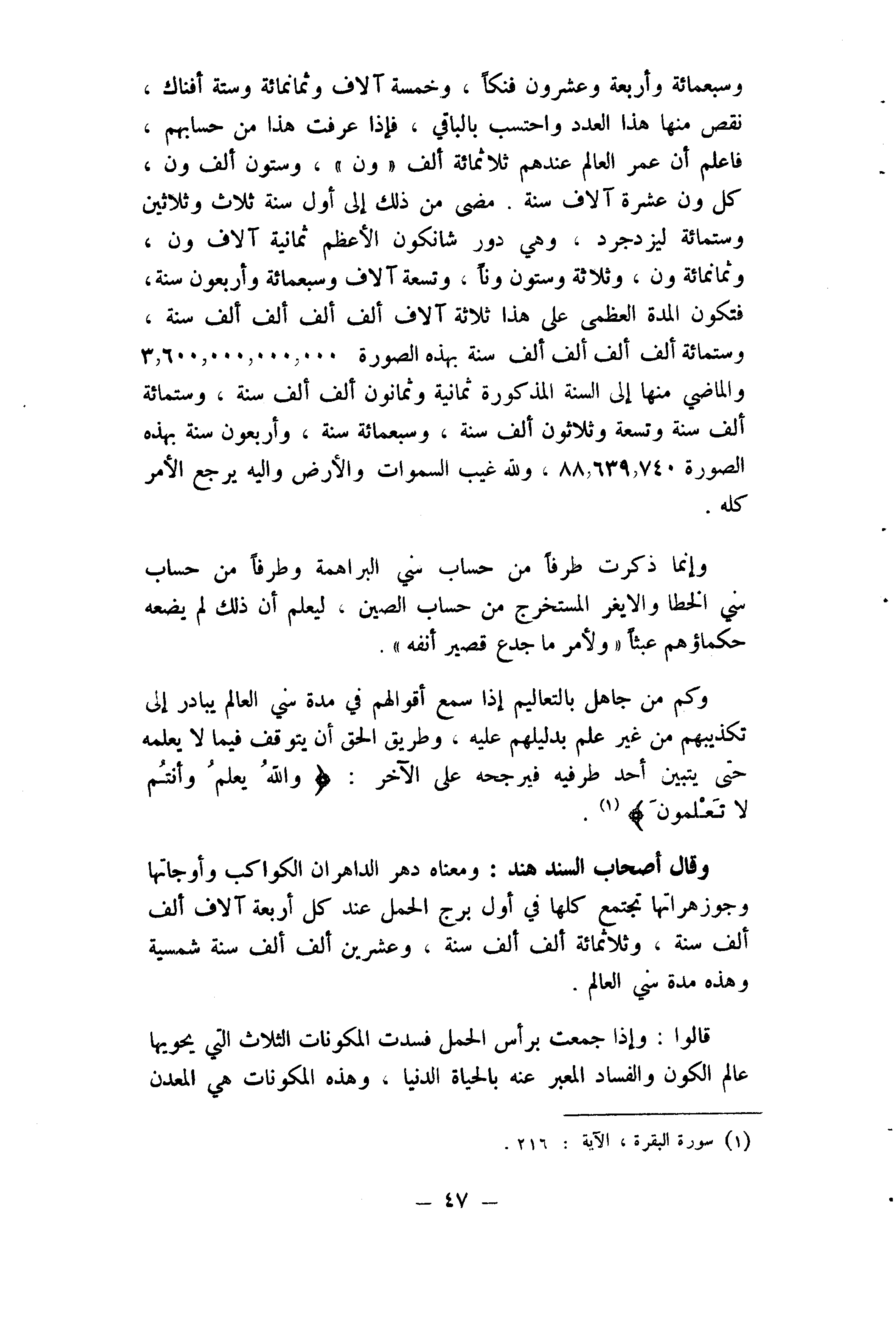 وَسَبْعمائة وَأَرْبَعَة وَعِشْرُونَ فنكا وَخَمْسَة آلَاف وَثَمَانمِائَة وَسِتَّة أفناك نقص مِنْهَا هَذَا الْعدَد واحتسب بِالْبَاقِي فَإِذا عرفت هَذَا من حسابهم فاسعلم أَن عمر الْعَالم عِنْدهم ثَلَاثمِائَة ألف ون وَسِتُّونَ ألف ون كل ون عشرَة آلَاف سنة مضى من ذَلِك إِلَى أول سنة ثَلَاث وَثَلَاثِينَ وسِتمِائَة ليزدجرد وَهِي دور شانكون الْأَعْظَم ثَمَانِيَة آلَاف ون وَثَمَانمِائَة ون وَثَلَاثَة وَسِتُّونَ ونا وَتِسْعَة آلَاف وَسَبْعمائة وَأَرْبَعُونَ سنة فَتكون الْمدَّة الْعُظْمَى على هَذَا ثَلَاثَة آلَاف ألف ألف ألف ألف سنة وسِتمِائَة ألف ألف ألف ألف سنة بِهَذِهِ الصُّورَة 360000000000 والماضي مِنْهَا إِلَى السّنة الْمَذْكُورَة ثَمَانِيَة وَثَمَانُونَ ألف ألف سنة وسِتمِائَة ألف سنة وَتِسْعَة وَثَلَاثُونَ ألف سنة سَبْعمِائة سنة وَأَرْبَعُونَ سنة بِهَذِهِ الصُّورَة 8863974 وَللَّه غيب السَّمَوَات وَالْأَرْض وَإِلَيْهِ يرجع الْأَمر كُله