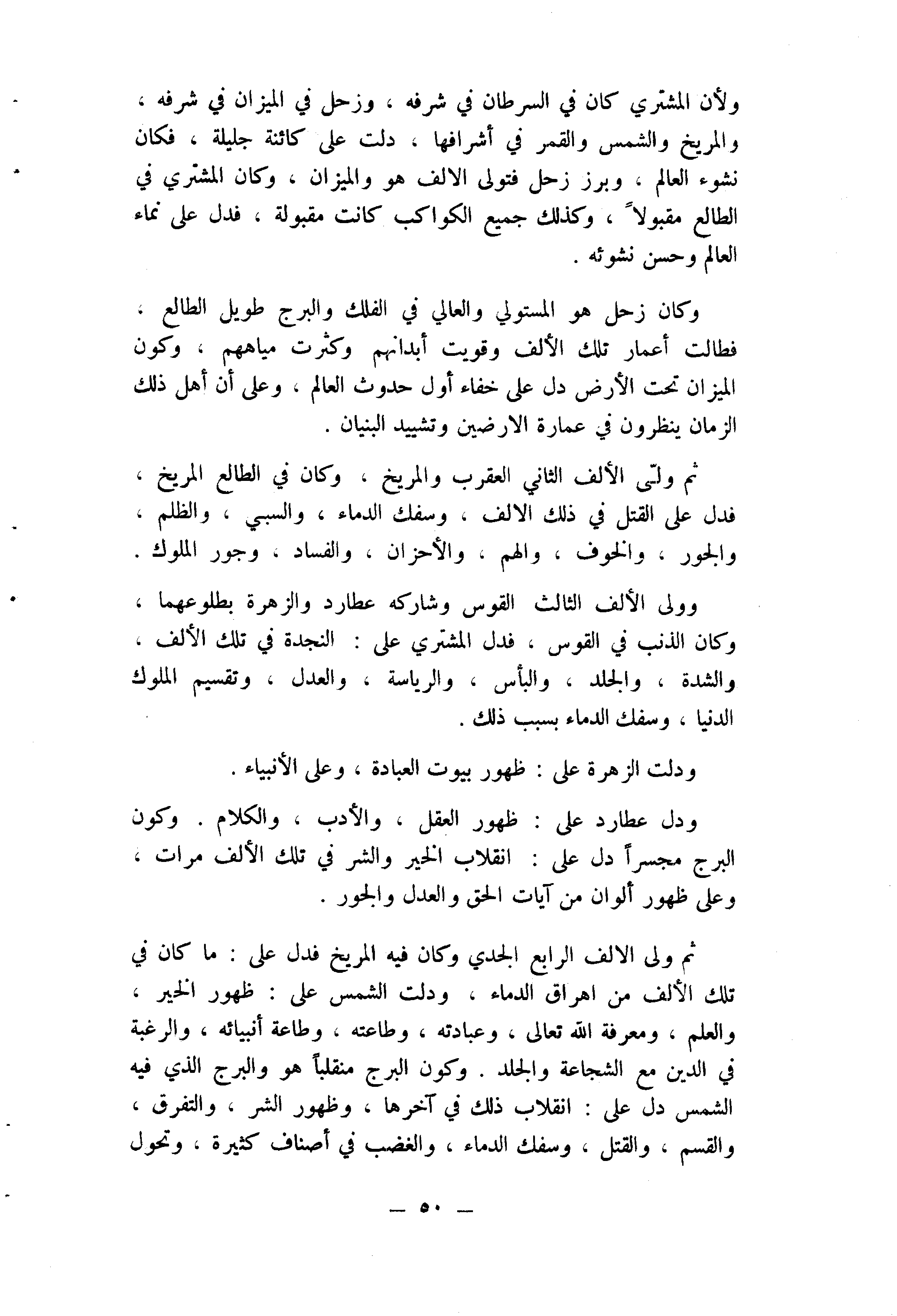 ثمَّ ولى الْألف الرَّابِع الجدي وَكَانَ فِيهِ المريخ فَدلَّ على مَا كَانَ فِي تِلْكَ الْألف من إهراق الدِّمَاء ودلت الشَّمْس على ظُهُور الْخَيْر وَالْعلم وَمَعْرِفَة الله تَعَالَى وعبادته وطاعته وَطَاعَة أنبيائه وَالرَّغْبَة فِي الدّين مَعَ الشجَاعَة وَالْجَلد وَكَون البرج منقلبا هُوَ والبرج الَّذِي فِيهِ الشَّمْس دلّ على انقلاب ذَلِك فِي آخرهَا وَظُهُور الشَّرّ والتفرق وَالْقسم وَالْقَتْل وَسَفك الدِّمَاء وَالْغَضَب فِي أَصْنَاف كَثِيرَة وتحول