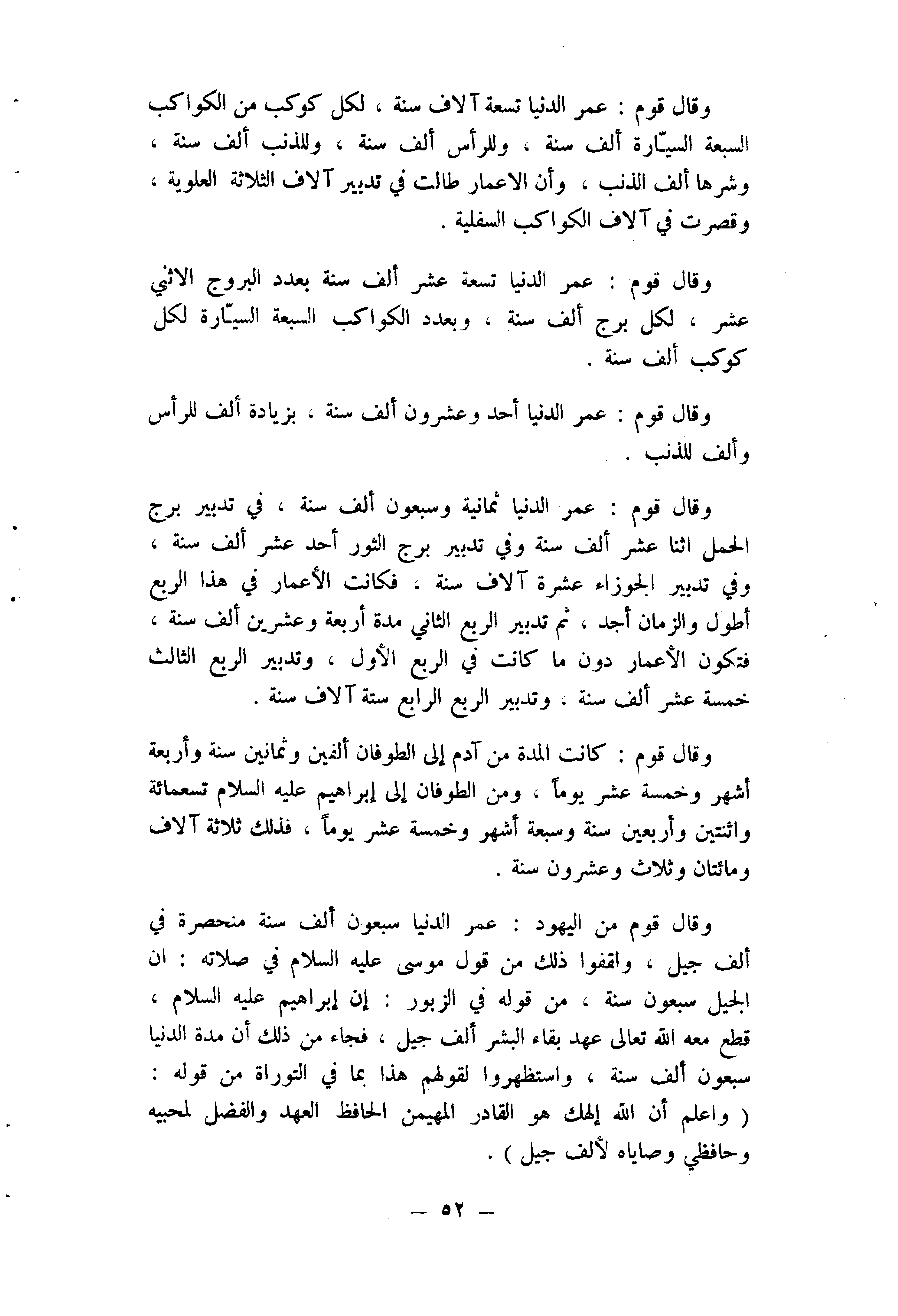 وَقَالَ قوم عمر الدُّنْيَا تِسْعَة آلَاف سنة لكل كَوْكَب من الْكَوَاكِب السَّبْعَة السيارة ألف سنة وللرأس ألف سنة وللذنب ألف سنة وشرها ألف الذَّنب وَأَن الْعمار طَالَتْ فِي تَدْبِير آلَاف الثَّلَاثَة العلوية وَقصرت فِي آلَاف الْكَوَاكِب السفلية