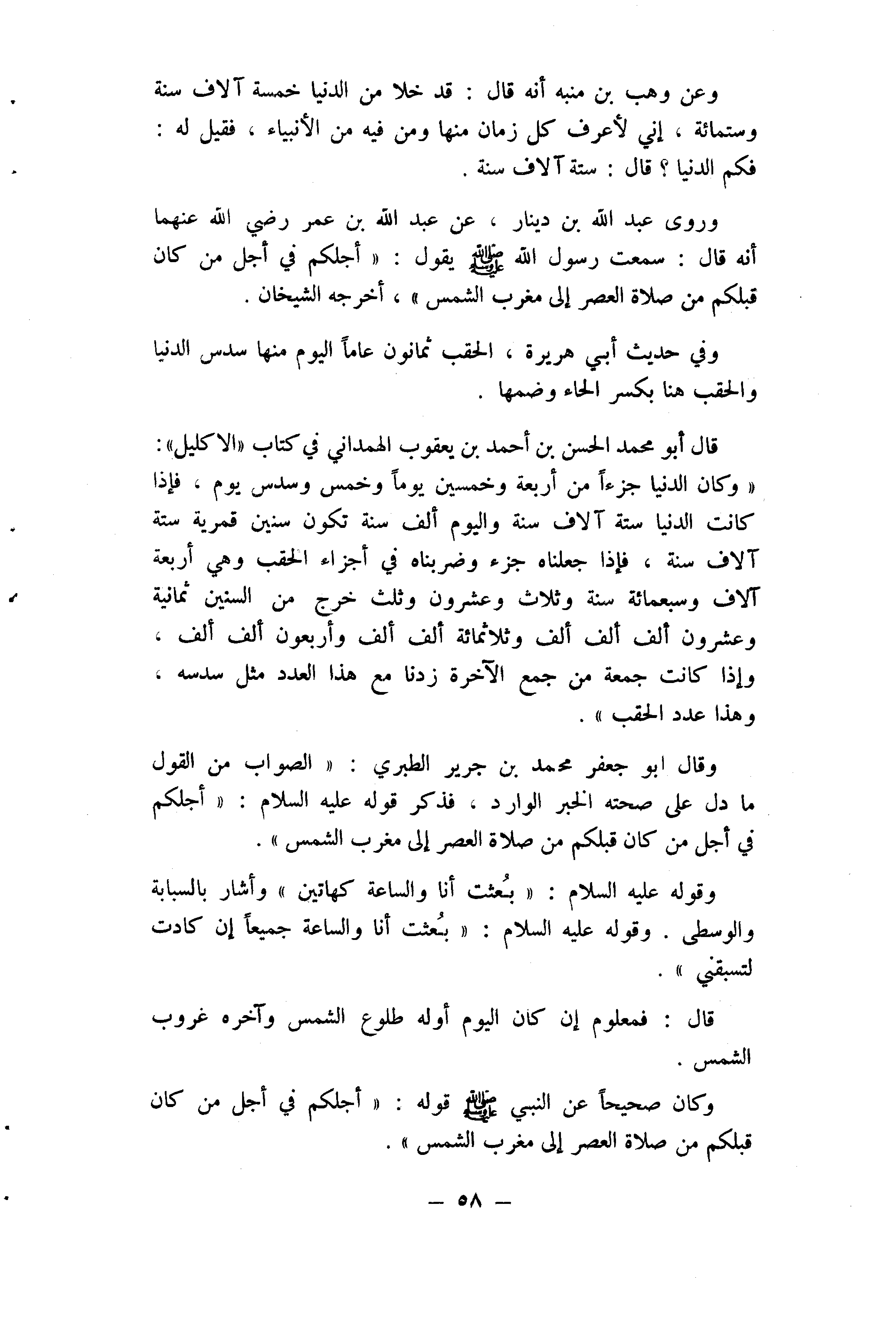 قَالَ أَبُو مُحَمَّد الْحسن بن أَحْمد بن يَعْقُوب الْهَمدَانِي فِي كتاب الأكاليل وَكَانَ الدُّنْيَا جُزْءا من أَرْبَعَة وَخمسين يَوْمًا وَخمْس وَسدس يَوْم فَإِذا كَانَت الدُّنْيَا سِتَّة آلَاف سنة وَالْيَوْم ألف سنة تكون سِنِين قمرية سِتَّة آلَاف سنة فَإِذا جَعَلْنَاهُ جُزْء وضربناه فِي أَجزَاء الحقب وَهِي أَرْبَعَة آلَاف وَسَبْعمائة سنة وَثَلَاث وَعِشْرُونَ وَثلث خرج من السِّتين ثَمَانِيَة وَعِشْرُونَ ألف ألف ألف وثلاثمائة ألف ألف وَأَرْبَعُونَ ألف الف وَإِذا كَانَت جُمُعَة من جمع الْآخِرَة زِدْنَا مَعَ هَذَا الْعدَد مثل سدسه وَهَذَا عدد الحقب