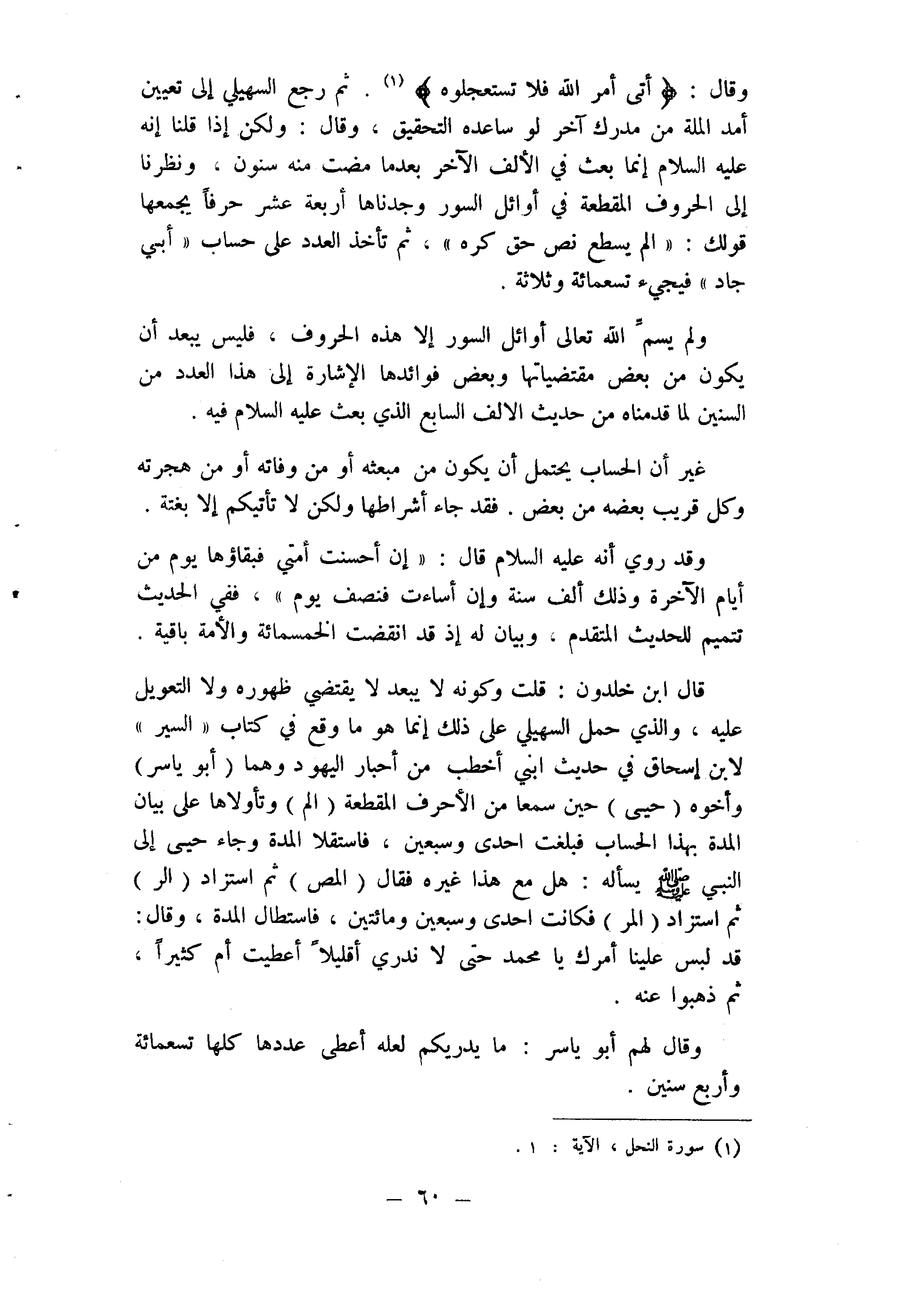 قَالَ ابْن خلدون قلت وَكَونه لَا يبعد لَا يَقْتَضِي ظُهُوره وَلَا التعويل عَلَيْهِ وَالَّذِي حمل السُّهيْلي على ذَلِك إِنَّمَا هُوَ مَا وَقع فِي كتاب السّير لِابْنِ اسحق فِي حَدِيث ابْني أَخطب من أَحْبَار الْيَهُود وهما أَبُو يَاسر وَأَخُوهُ حبي حِين سمعا من الأحرف الْمُقطعَة ألم وتأولاها على بَيَان الْمدَّة بِهَذَا الْحساب فبلغت إِحْدَى وَسبعين فاستقلا الْمدَّة وَجَاء حبي إِلَى النَّبِي صلى الله عَلَيْهِ وَسلم يسْأَله هَل مَعَ هَذَا غَيره فَقَالَ المص ثمَّ اسْتَزَادَ المر ثمَّ اسْتَزَادَ المر فَكَانَت إِحْدَى وَسبعين وَمِائَتَيْنِ فاستطال الْمدَّة وَقَالَ قد لبس علينا أَمرك يَا مُحَمَّد حَتَّى لَا نَدْرِي أقليلا أَعْطَيْت أم كثيرا ثمَّ ذَهَبُوا عَنهُ
